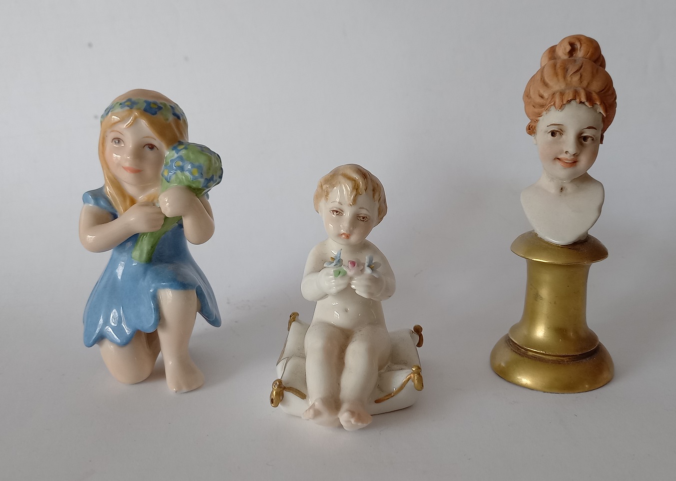 Tre figure in porcellana e biscuit h. max cm.9,5 - manifatture Royal Copenhagen e N coronata con marchi ed una firmata Benacchio