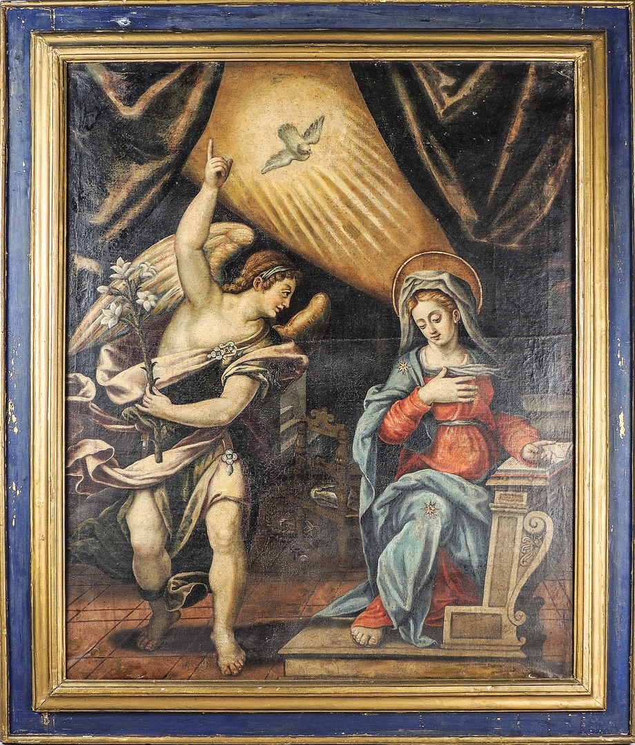 SCUOLA VENETO-EMILIANA DELLA PRIMA METÀ DEL XVII SECOLO Annunciazione olio su tela, in cornice cm 110x89