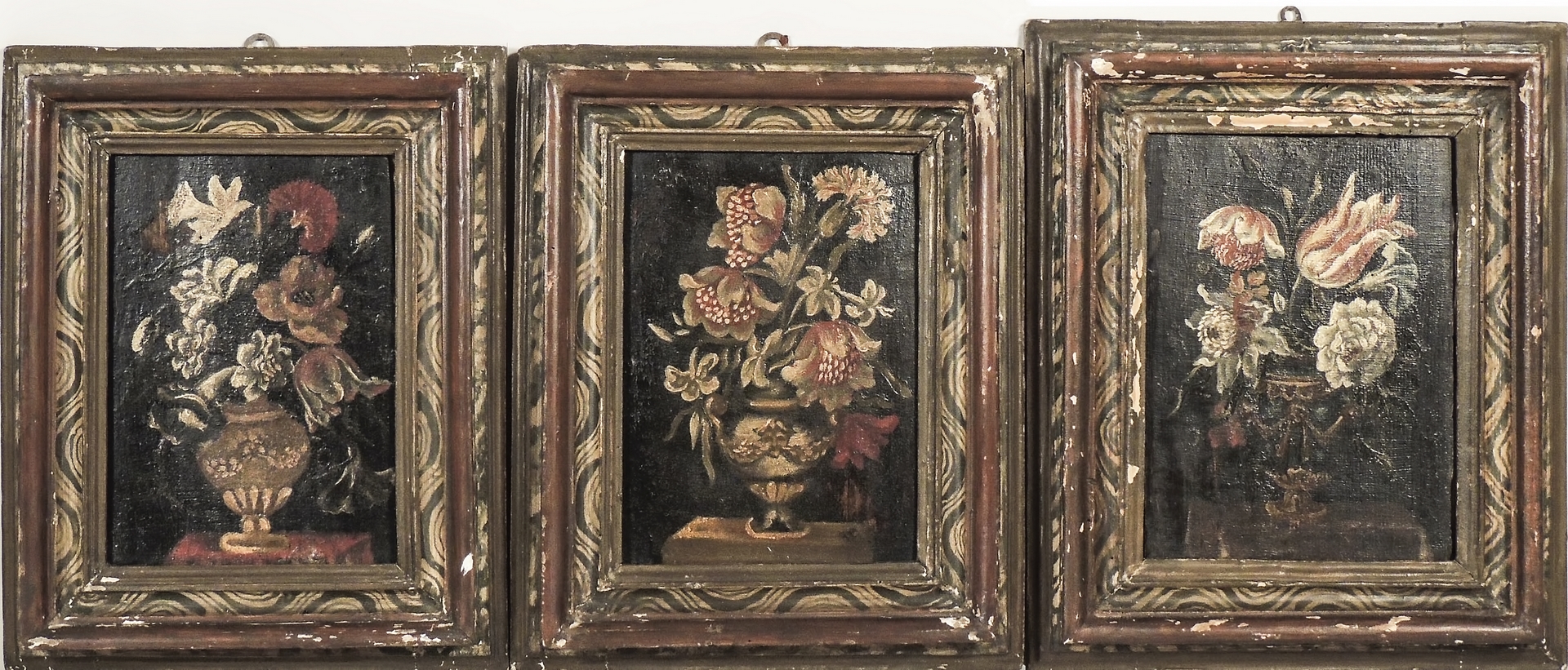 TRIONFI DI FIORI serie di tre dipinti ad olio su tavoletta, in cornici dipinte a finta radica cm 29x20