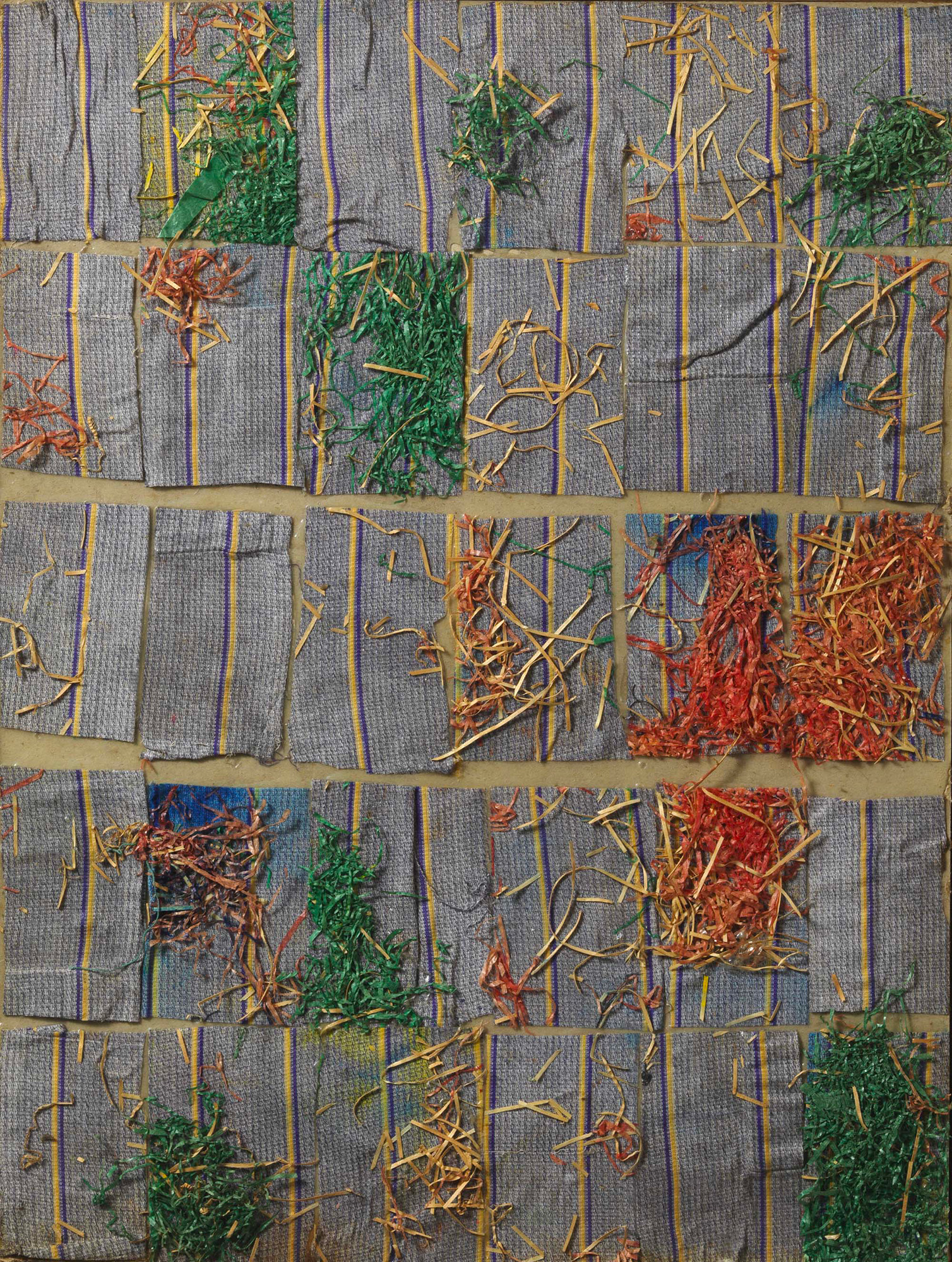 Collage di stoffa e paglia colorata su cartone, cm. 53 x 40