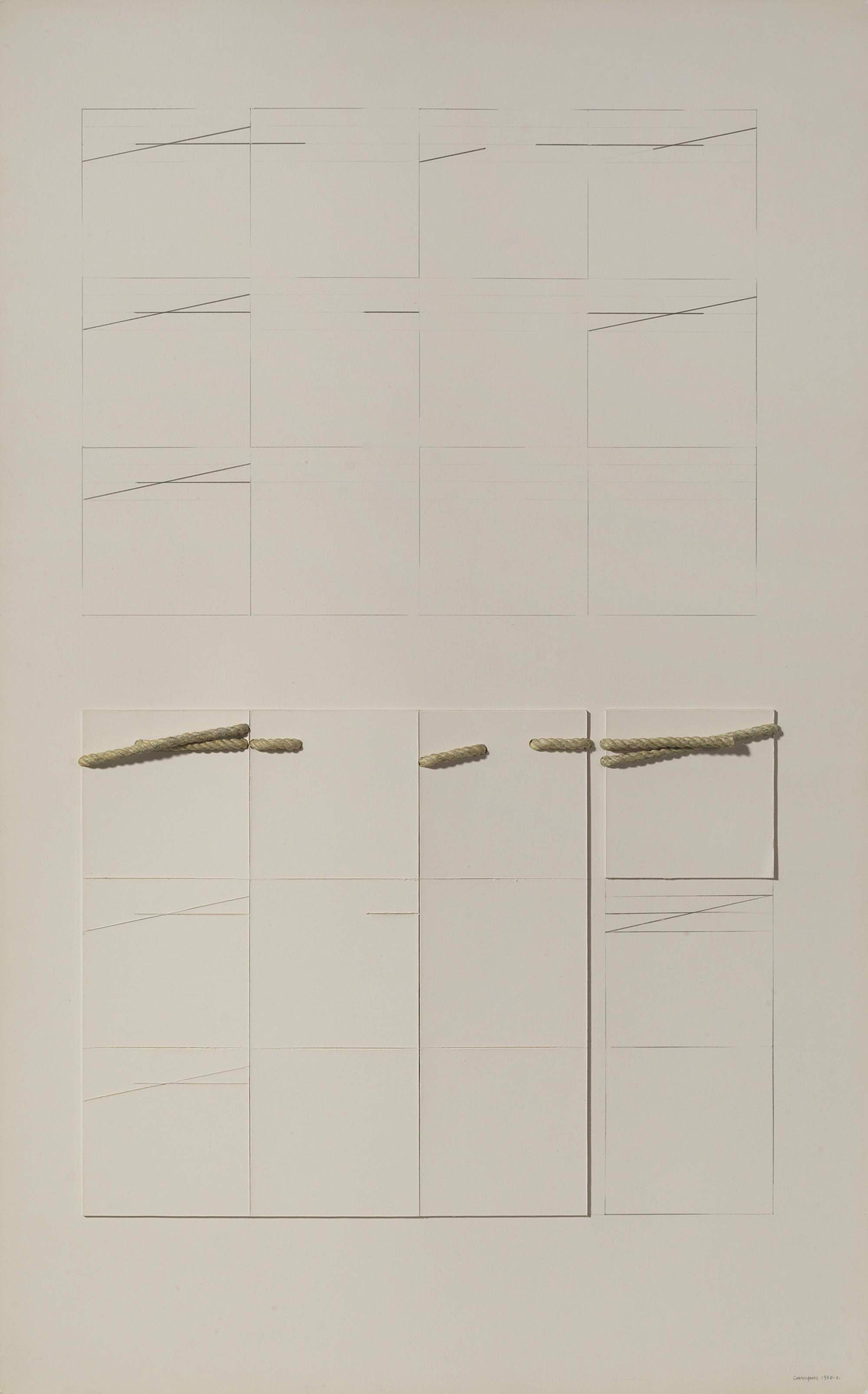 Matita e collage di cartoni e corde su cartone, cm. 79 x 49