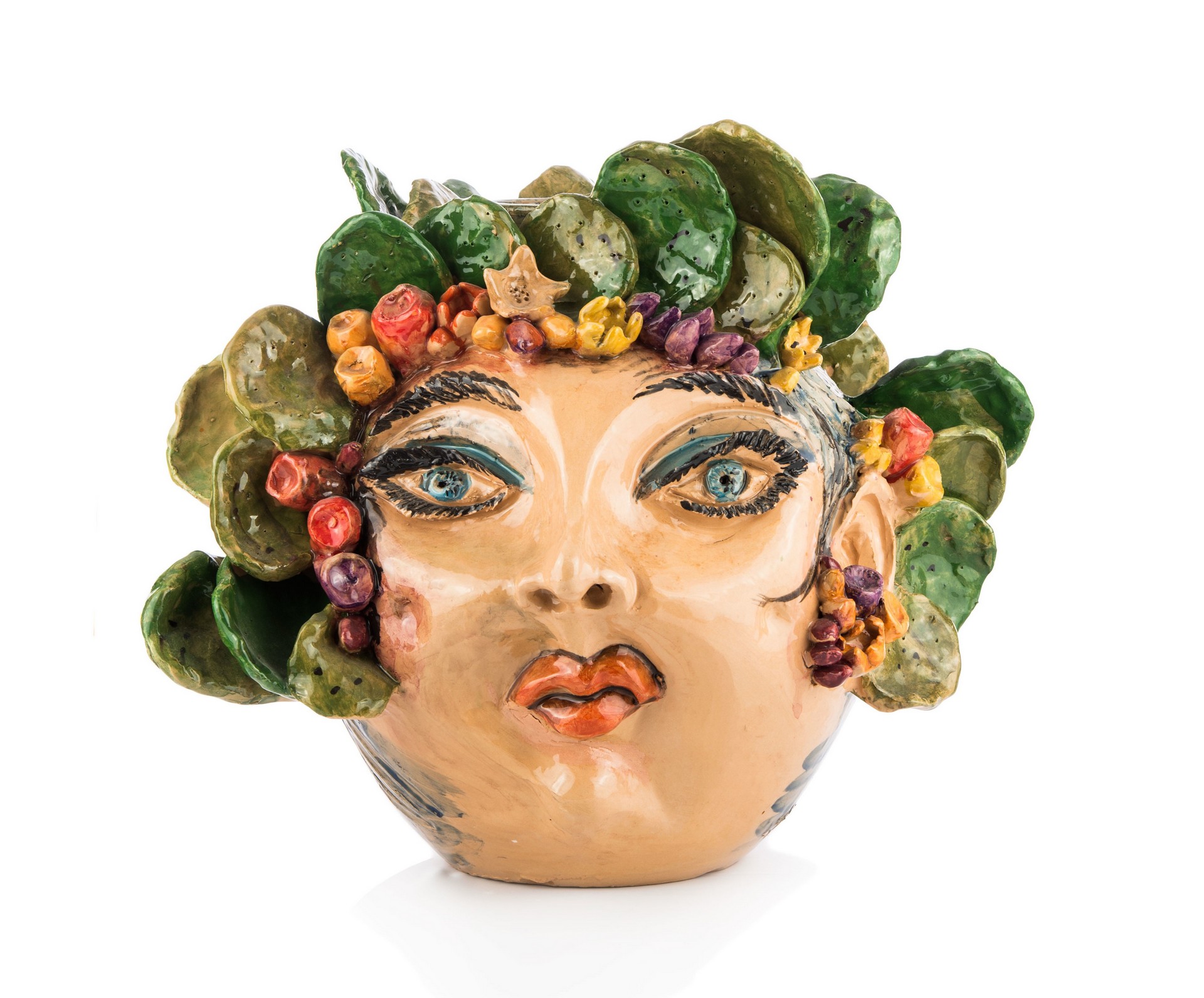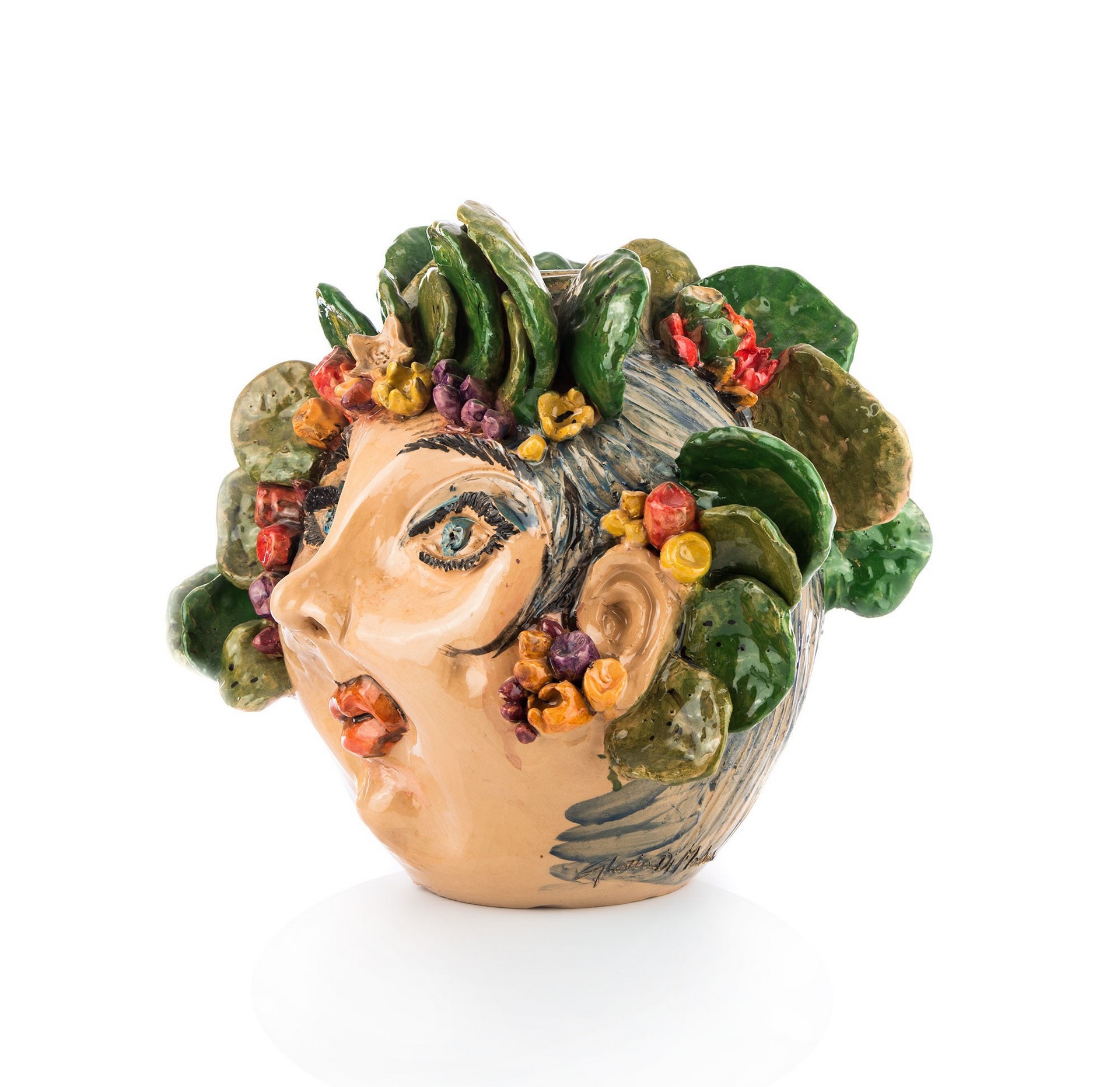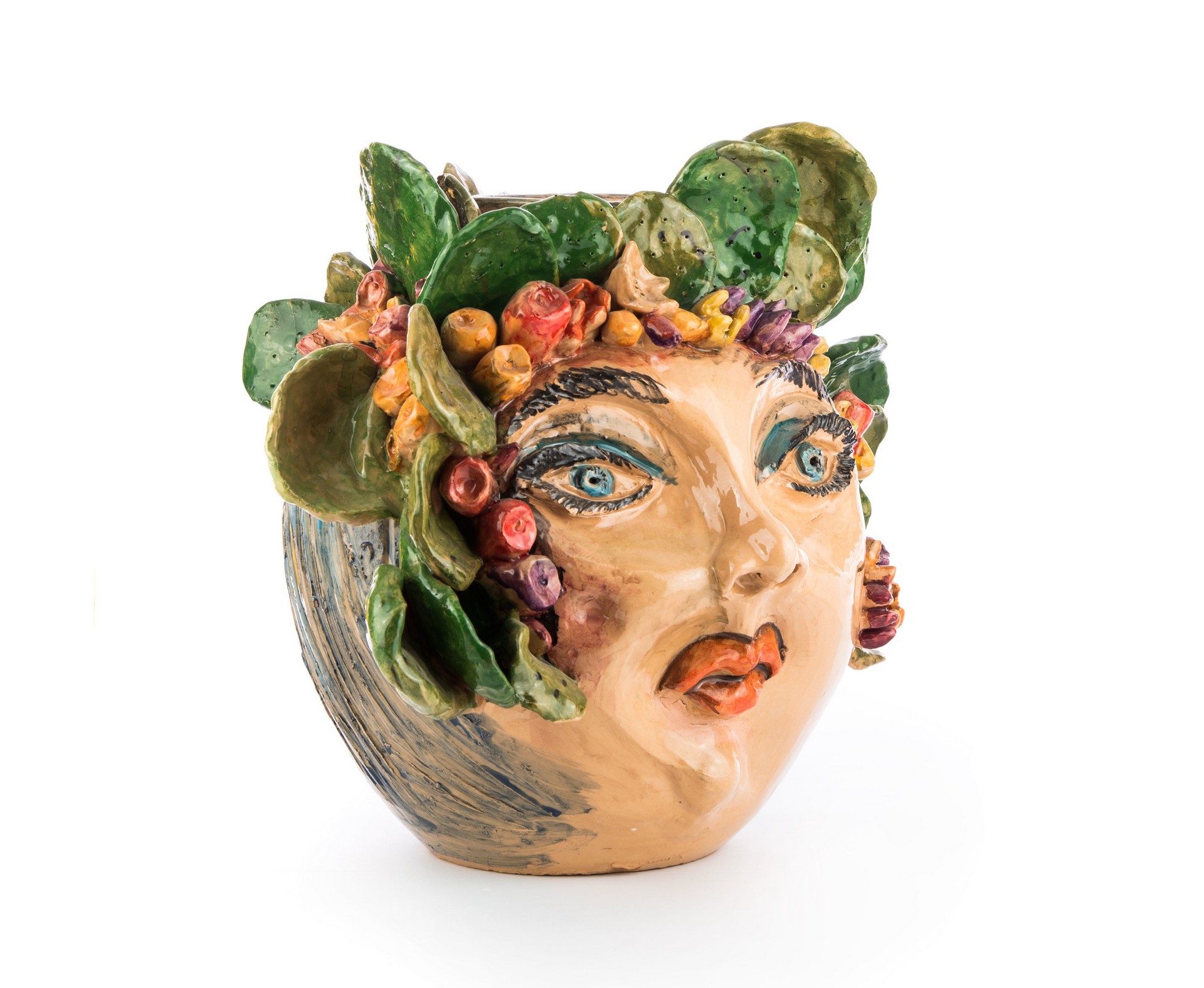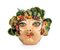 Vaso ironico raffigurante donna con ficodindia sulla testa. Fatto a mano. Questa è un’opera unica non replicabile. Maiolicata con finitura lucida.