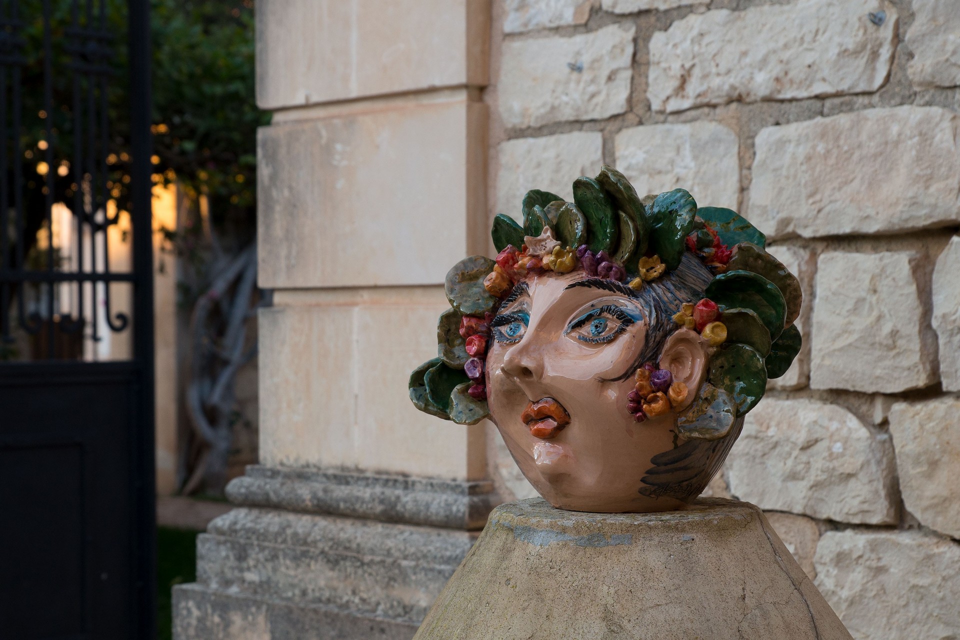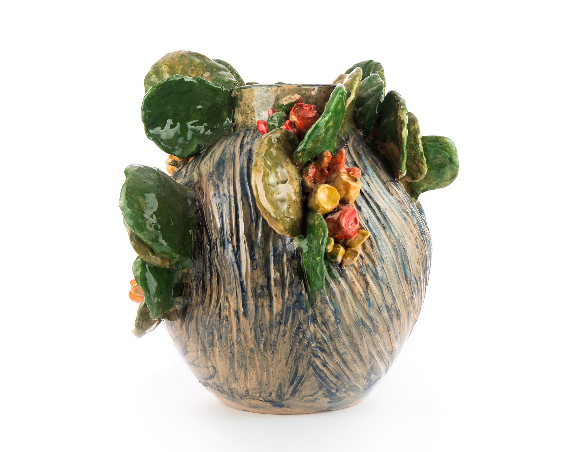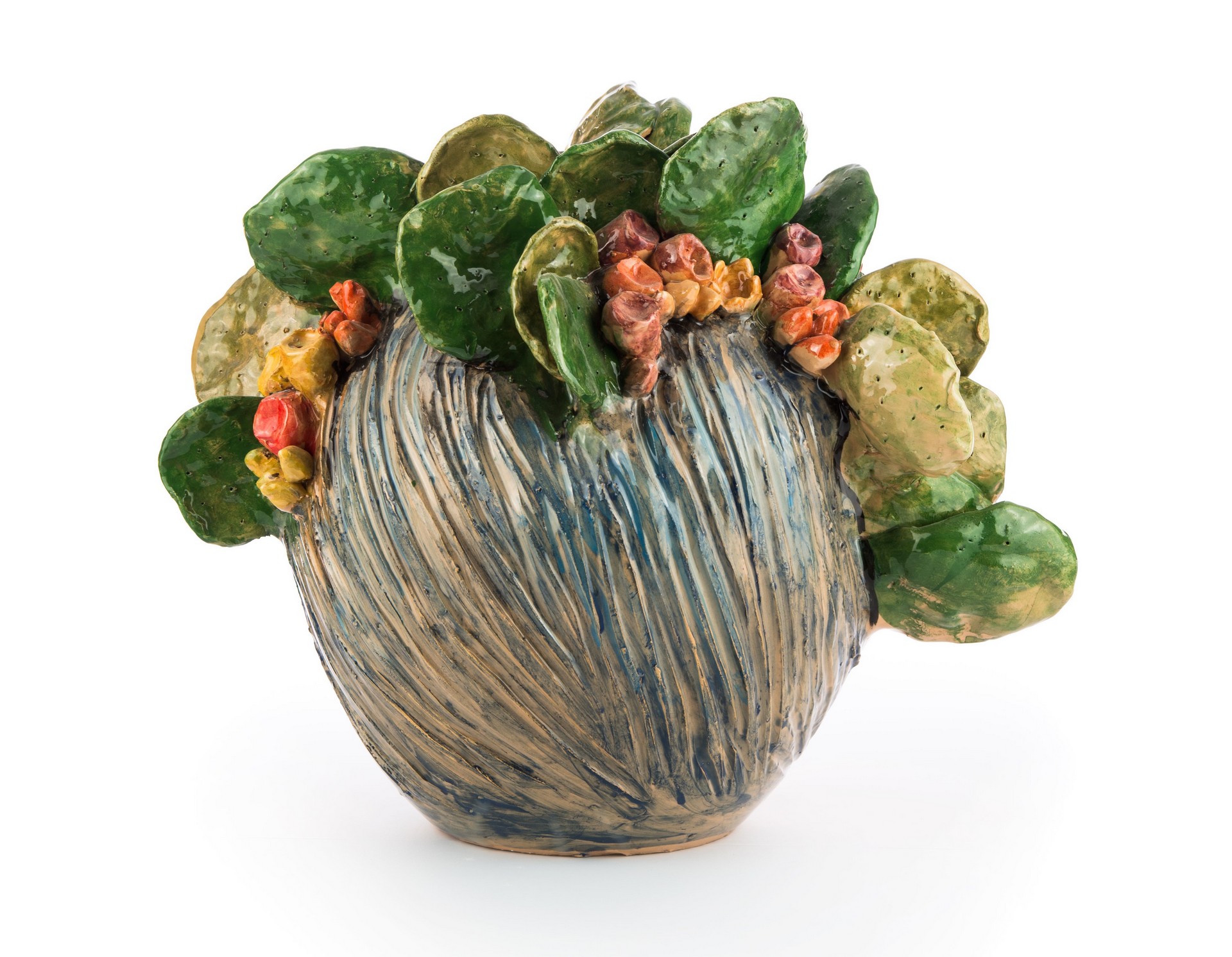 Vaso ironico raffigurante donna con ficodindia sulla testa. Fatto a mano. Questa è un’opera unica non replicabile. Maiolicata con finitura lucida.