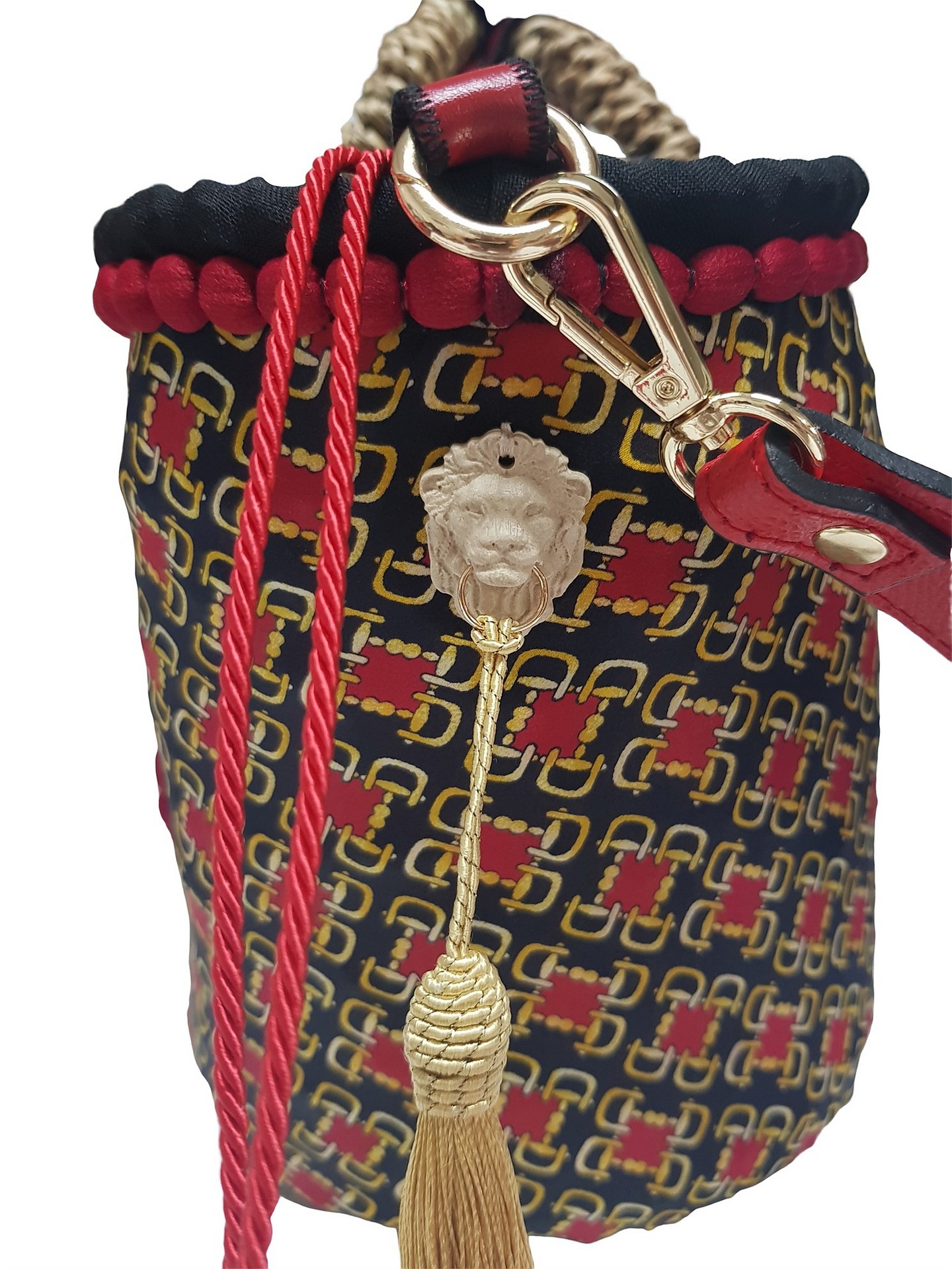 Rivestimento in seta pregiata si distingue per la sua linea classica e avvolgente ideale per occasioni di cerimonia e serate di gala, logo centrale in pietra naturale con stemma araldico delle due Sicilie e teste di leoni laterali chiusura a sacco e campana, tracolla in dotazione.