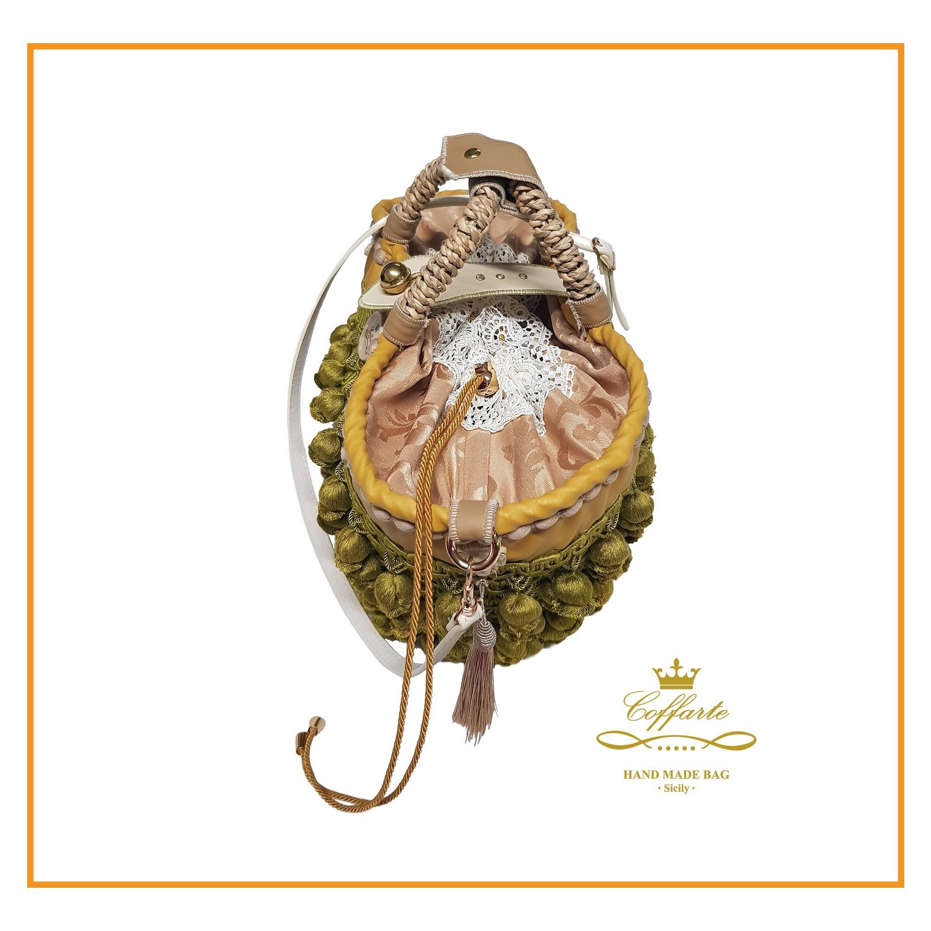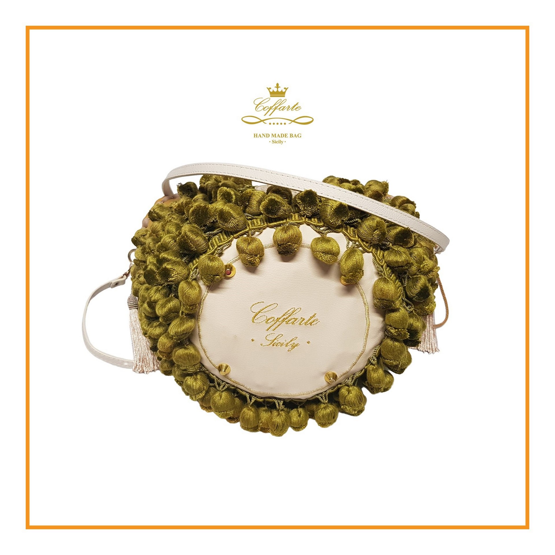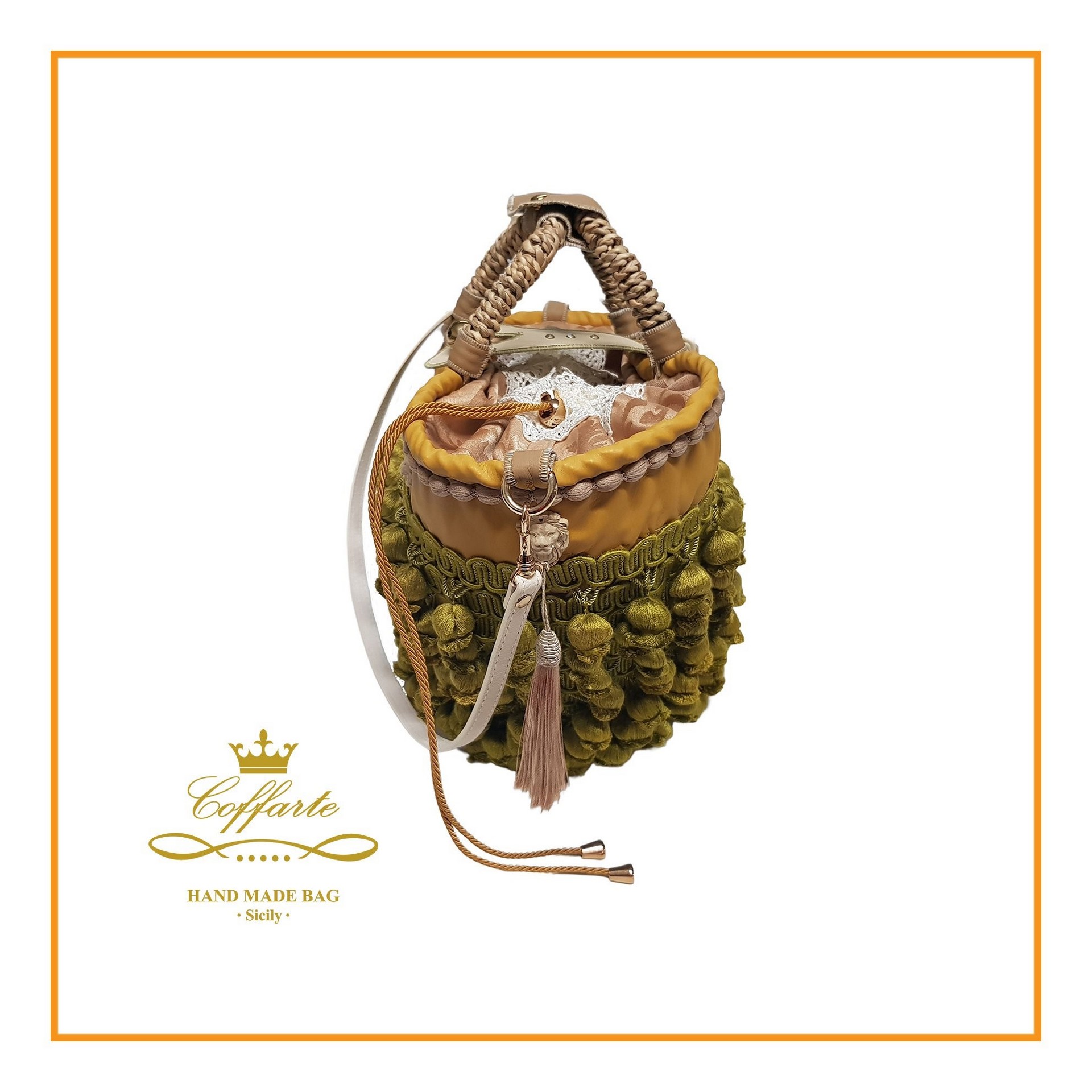 passamaneria Coffarte Sicily - Coffa medusa oliver cm 40x24 escluso manici; kg 0,900 passamaneria Rivestimento in passamaneria a cipollina ed ecopelle, con marchietto coffarte e arricchita da inserti in pietra naturale e incisa, con pietra raffigurante testa di medusa e teste di leoni laterali con relative nappine pendenti. Utilizzo multiuso, a manico e tracolla regolabile e rimovibile. Chiusura a sacco e a campana.