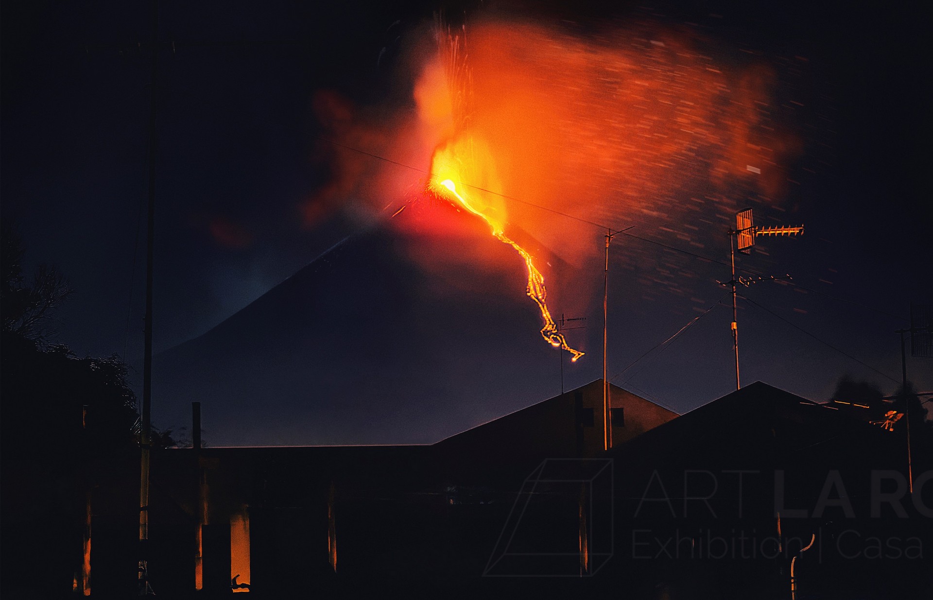 tela opaca su telaio in legno mm 17 fotografia Angelo Lipari (Acireale 1996) - Pioggia di Fuoco cm 35 x 50 fotografia Eruzione vulcanica del monte Etna del dicembre 2017, vista da Acireale (CT).