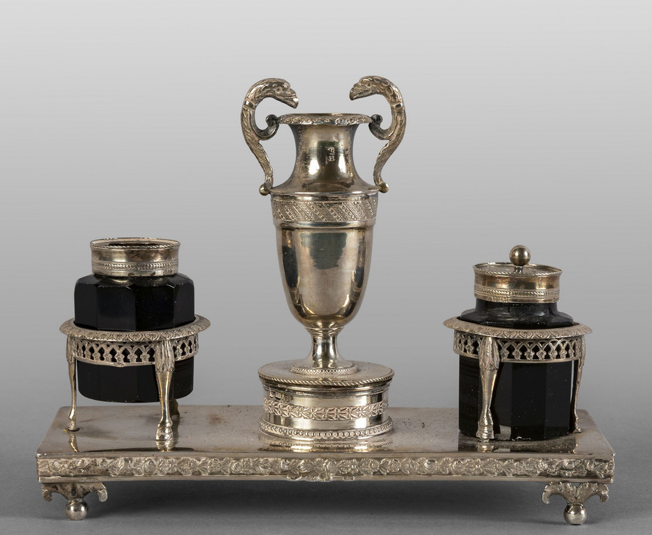 Calamaio Impero in argento con vasetto al centro, sec.XIX