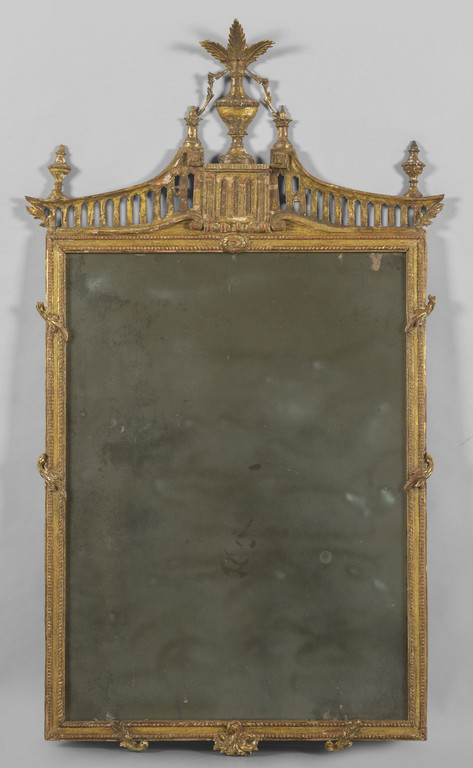 Specchiera Luigi XVI in legno intagliato e dorato, parte superiore a balaustra terminante con vaso, II metà sec.XVIII (difetti nella doratura)