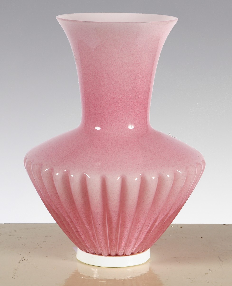 BAROVIER & TOSO. Vaso modello Les enokiens. Les enokiens vase. Vetro soffiato rosa. Cm 27x33. 1980.