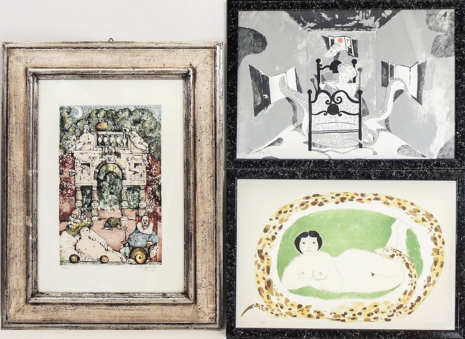 ANTONIO POSSENTI Nudo femminile, Interno di camera e Scorcio di giardino con personaggi raccolta di tre litografie, due numerate e una prova d'autore, firmate, in cornice (3) cm 35x50 e cm 37x23