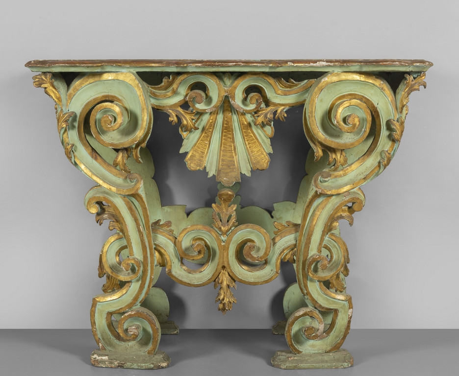 Console in legno intagliato a volute e laccato