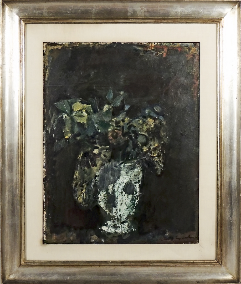 UGO CAPOCCHINI (1901-1980) Vaso con fiori olio su cartone, firmato, anche al verso firmato, in cornice cm 65x50 Reca cartiglio "Mostra Mercato Nazionale d'Arte Contemporanea, Palazzo Strozzi, Firenze"; reca timbro "Galleria Santacroce Firenze" n° 1169
