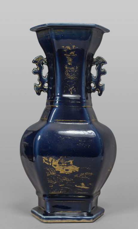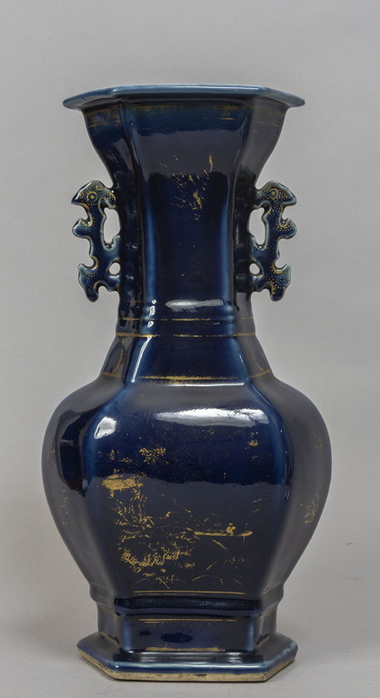 Vaso biansato in porcellana a fondo blu con decoro in oro a freddo, Cina sec.XIX