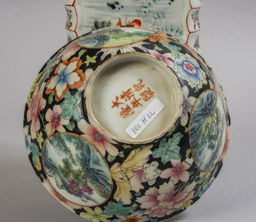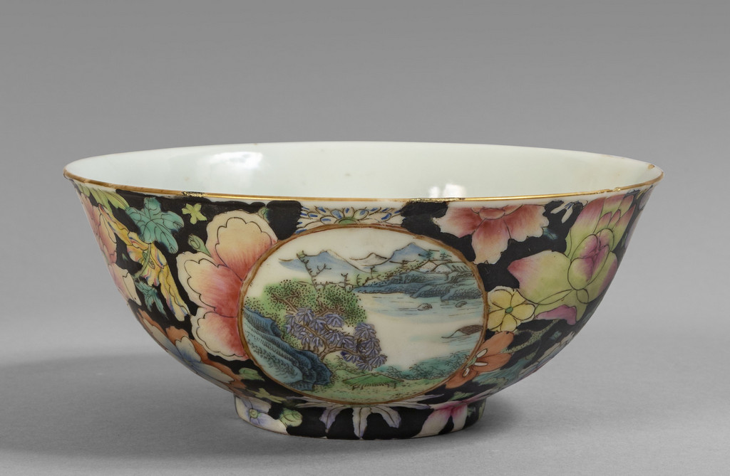 Ciotola Guan Zu in porcellana policroma con scene raffiguranti paesaggi, marcata sul fondo, Cina inizi sec.XX