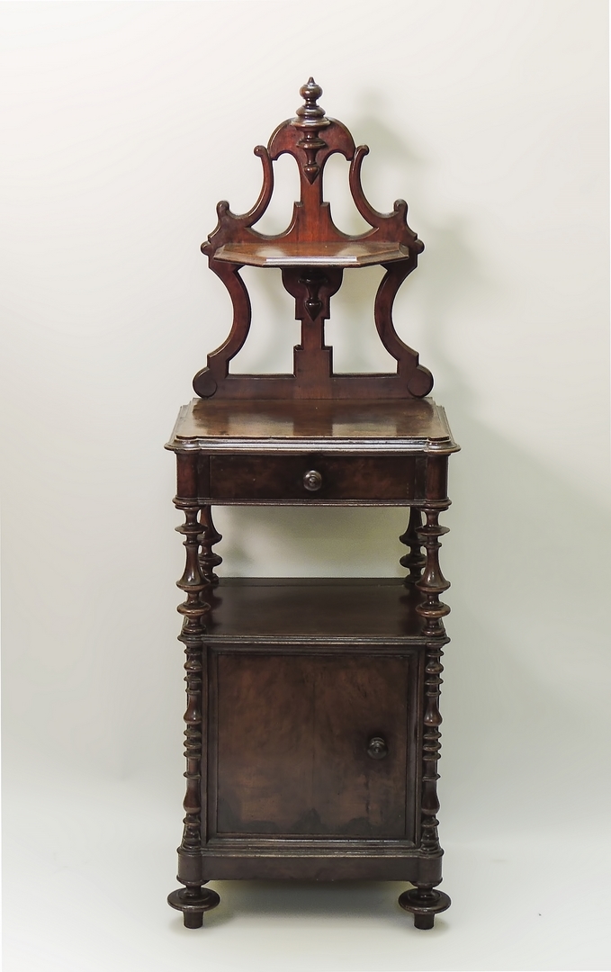 COMODINO IN MOGANO metà del XIX secolo alzata intagliata con volute, girali e piccola mensola, un cassetto sorretto da quattro colonne tortili, uno sportello tra lesene tornite, piedi a mensola h cm 139x47x38