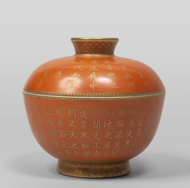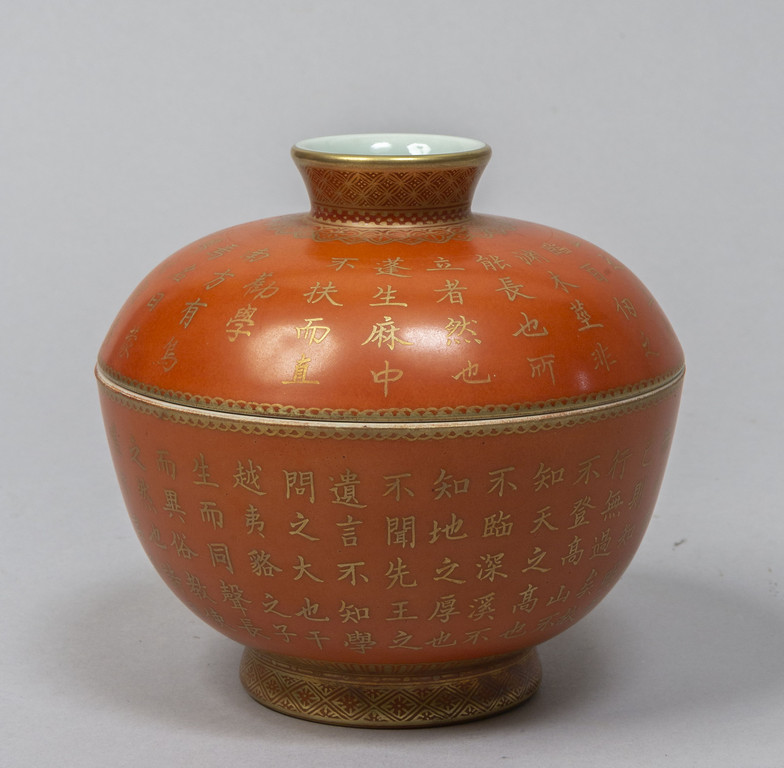 Scatola con coperchio in porcellana arancione con scritte in oro, marcata alla base