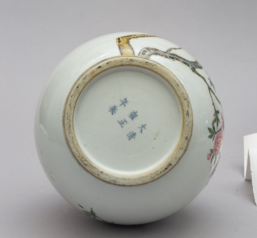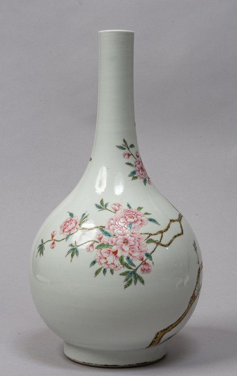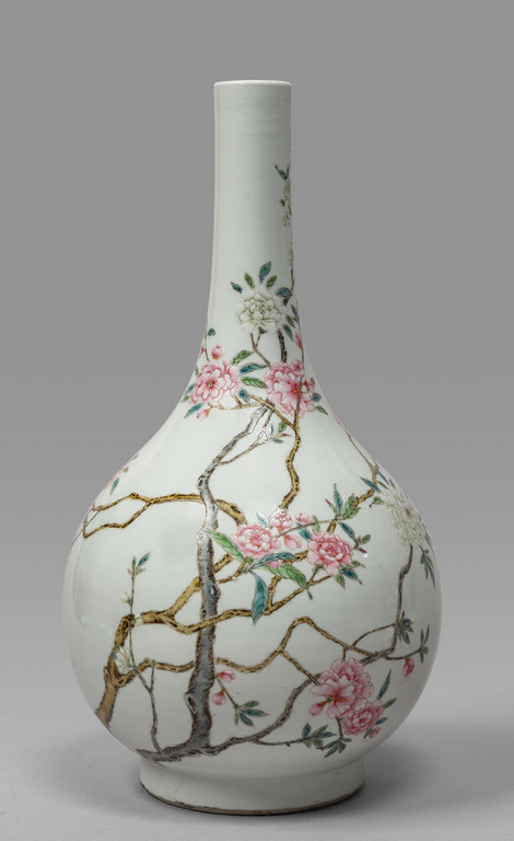 Bottiglia in porcellana bianca decorata con rami fioriti, marcata alla base, Cina Repubblica sec.XX