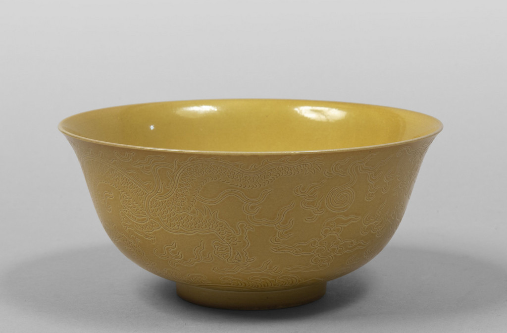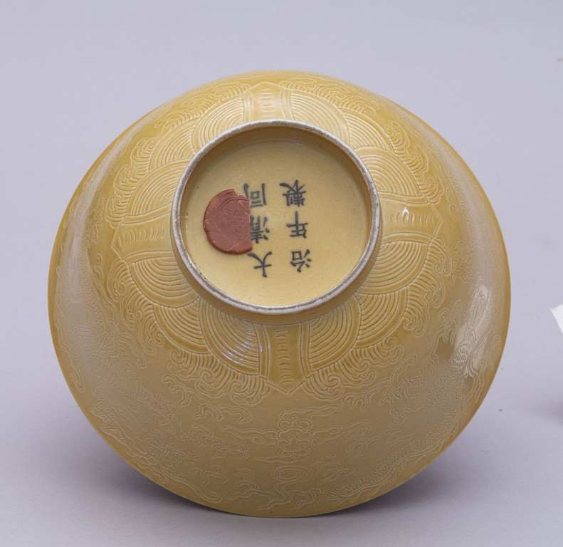 Ciotola in porcellana a fondo giallo, decoro inciso a dragoni, marcata sul fondo, Cina sec.XX