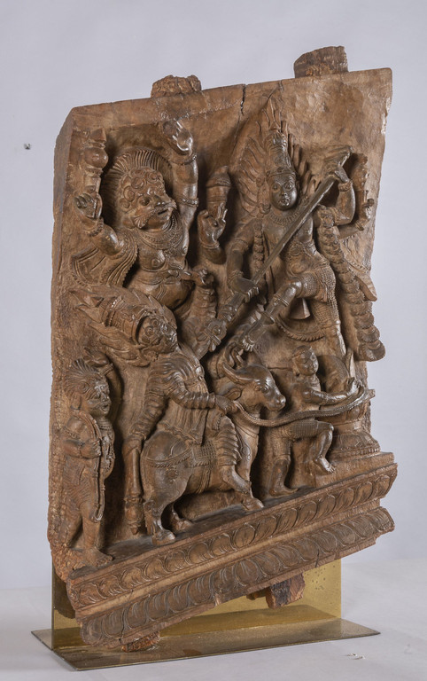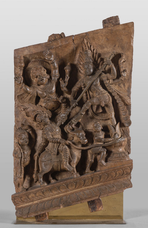 Divinità, bassorilievo in legno scolpito, supporto moderno in ottone, India sec.XIX
