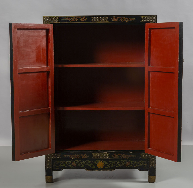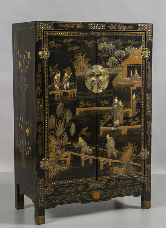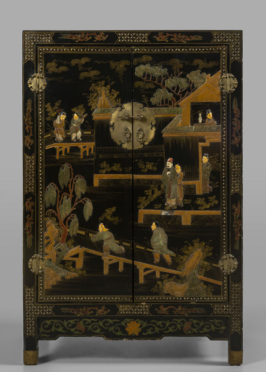 Credenza a due sportelli in lacca nera con scene di vita cinese con personaggi in rilievo, Cina sec.XX