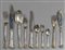 Servizio di posate in argento composto da: 30 forchette grandi, 18 piccole, 34 da dolce, 21 coltelli grandi, 18 piccoli, 18 cucchiai grandi, 36 cucchiaini, 24 forchette e 24 coltelli da pesce, 3 forchettine