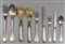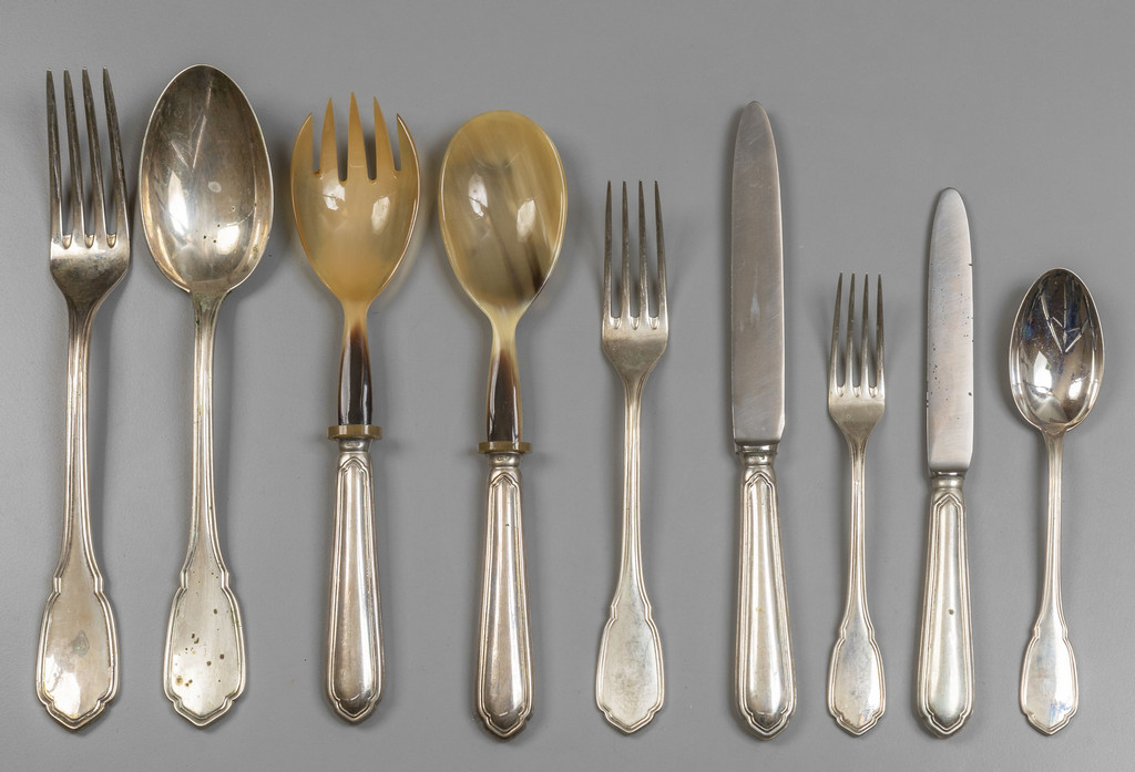 Servizio di posate in argento per 12 composto da 12 forchette grandi e 12 piccole, 12 coltelli grandi e 12 piccoli, 12 cucchiai grandi e 12 piccoli, 1 mestolo, 1 forchettone, 1 cucchiaione e 2 posate da portata per insalata