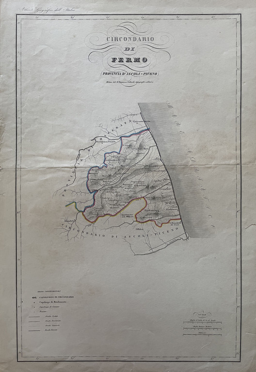 Grande carta geografica antica del Circondario di FERMO. Prov. D'ASCOLI - PICENO, edita da Francesco Vallardi, esponente di una dinastia di editori milanesi, all'interno dell'Atlante Geografico d'Italia, opera che si proponeva di ricalcare le fortunate orme dell'atlante dello Zuccagni-Orlandini il quale, benché di pochi anni precedente, risaliva al periodo pre-unitario. Il Vallardi riutilizzò le lastre, non prima di averle aggiornate, ma non sempre ricordando gli incisori e gli estensori dei dati corografici e statistici.