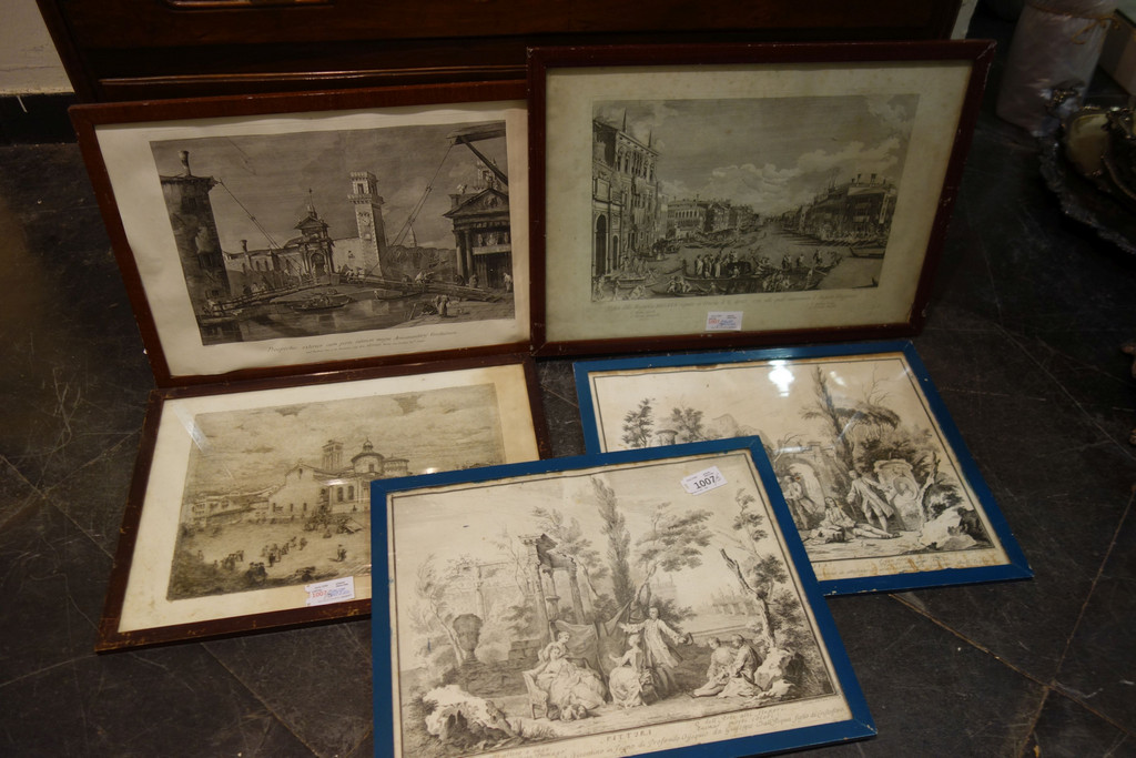 Cinque stampe raffiguranti Venezia di varie misure ed epoche, due dall'Acqua datate 1979, due da Canaletto ed una più moderna