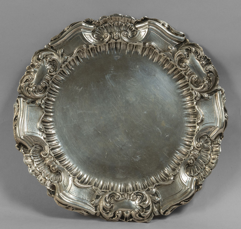 Piatto in argento con bordo riccamente sbalzato in stile barocco con conchiglie