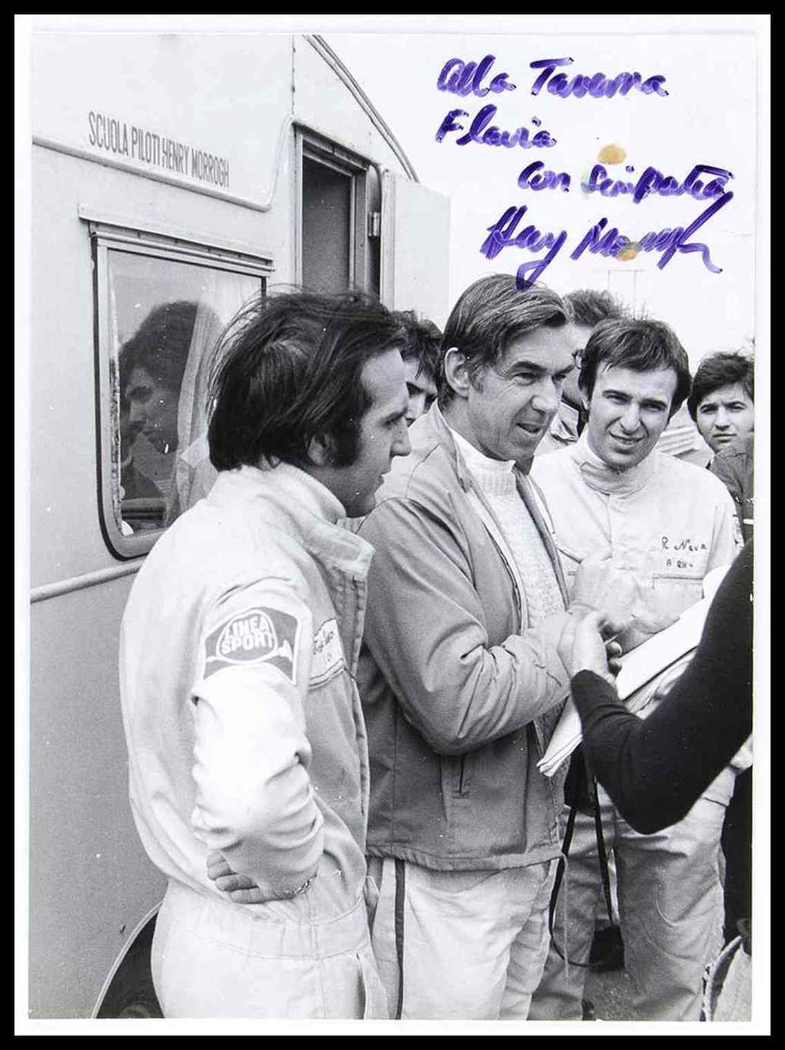 Bella foto che ritrae Henry Morrogh fondatore della Scuola Piloti omonima (HM Racing Drivers School) davanti al suo camper a Vallelunga ed alcunui piloti. Anni '70