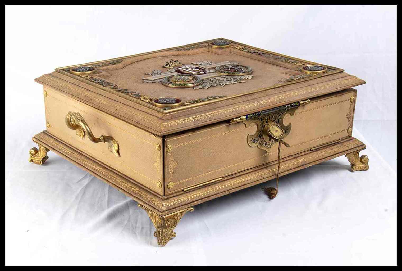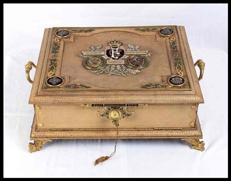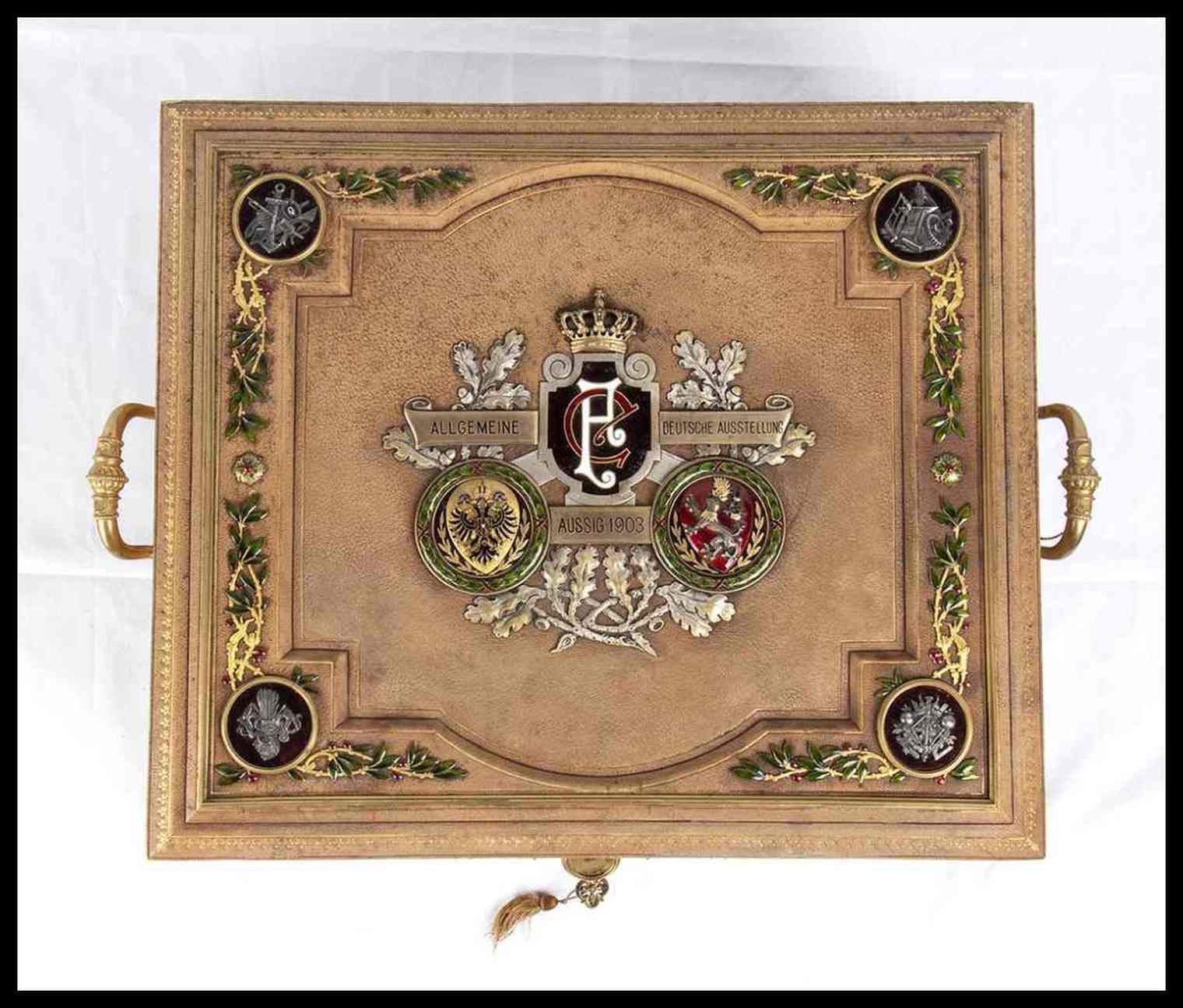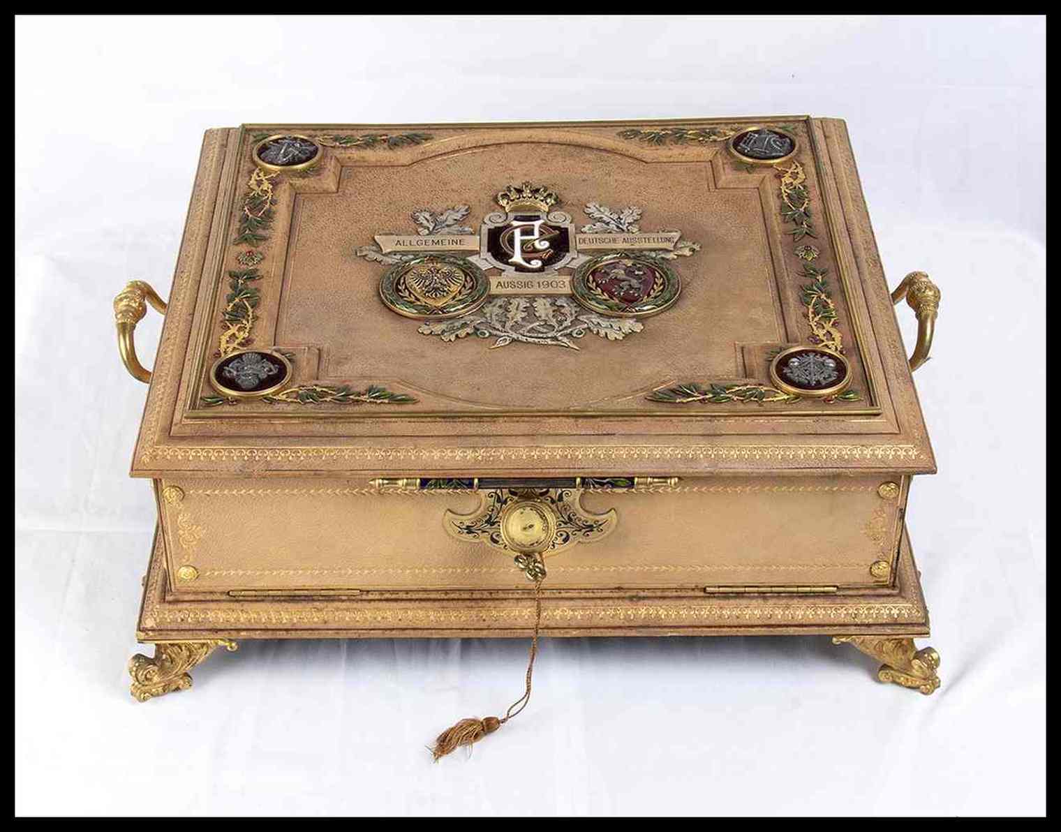 Scatola porta documenti in legno, rivestita in pelle, con due manici laterali, quattro piedi di appoggio e ferramenta in bronzo dorato, smalti colorati con dettagli guilloche, particolari in lamina d'argento o metallo argentato. Usata per contenere un premio o dei documenti di riconoscimento per un alto funzionario dello stato austriaco, o persona di merito, in occasione della "ESPOSIZIONE INTERNAZIONALE TEDESCA del 1903", come evidente dall'incisione "ALLGEMEINE DUTSCHE AUSSTELLUNG AUSSIG 1903". Iniziali "C A" con corona dorata applicata, smalti bianco e rosso in stemma centrale; il fregio di sinistra (smalti colorati con aquila bicefala dall'impero Asburgico) ed il fregio di destra (smalti colorati con leone elmato) a rappresentare il simbolo della città di Ústí nad Labem - Aussig, all'epoca Austria, ora città cecoslovacca; serti di alloro e quercia; medaglioni con applicazioni in probabile argento dei simboli delle arti e mestieri ai quattro angoli del coperchio; serti di alloro e quercia in lamierino argentato, a smalti dorato, verde e rosso; cerniere con dettagli smaltati; pelle color rosato con ricami dorati. La scatola si apre da una serratura a scomparsa, con un grande vano portaoggetti rivestito in velluto rosso.