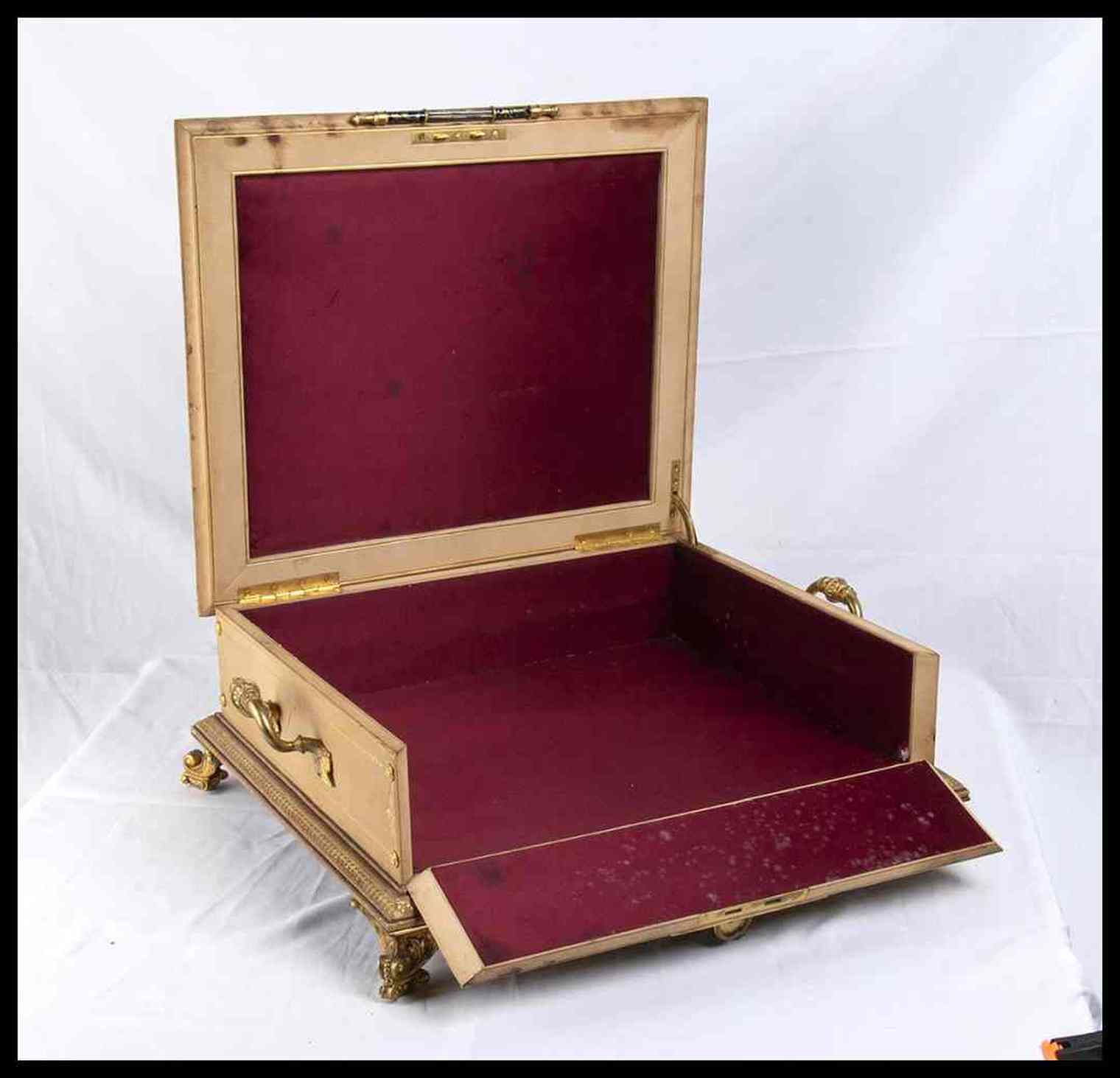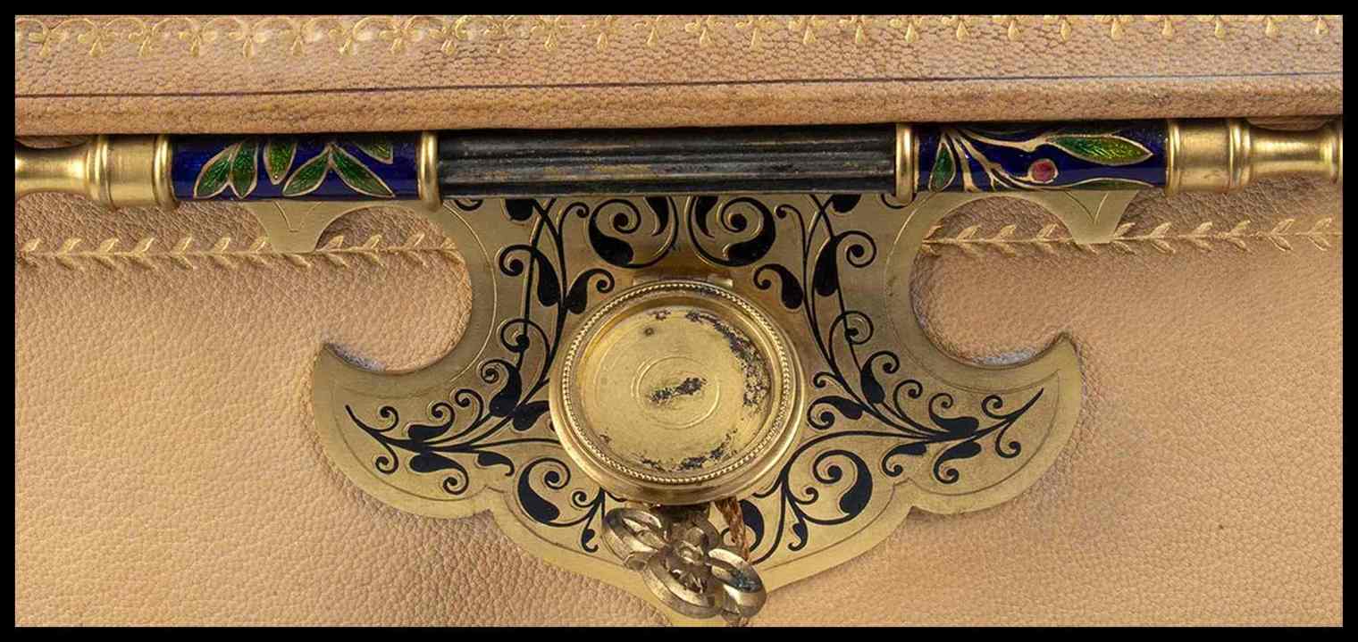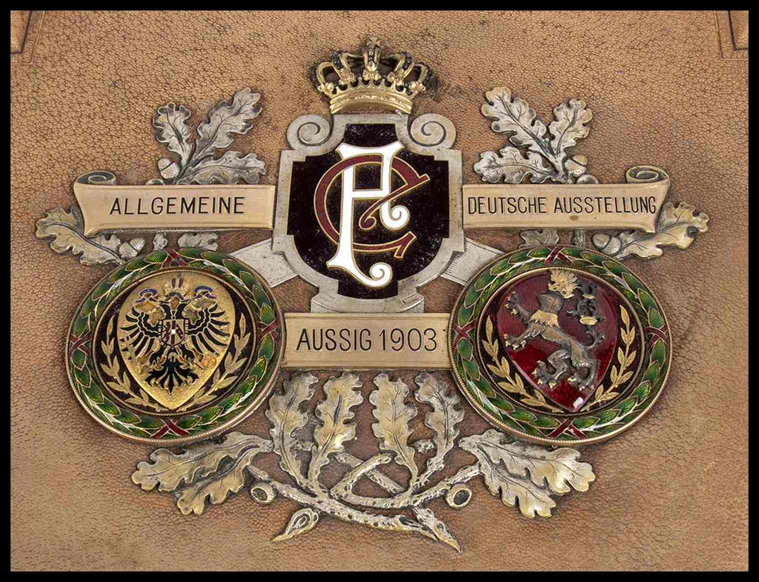 Scatola porta documenti in legno, rivestita in pelle, con due manici laterali, quattro piedi di appoggio e ferramenta in bronzo dorato, smalti colorati con dettagli guilloche, particolari in lamina d'argento o metallo argentato. Usata per contenere un premio o dei documenti di riconoscimento per un alto funzionario dello stato austriaco, o persona di merito, in occasione della "ESPOSIZIONE INTERNAZIONALE TEDESCA del 1903", come evidente dall'incisione "ALLGEMEINE DUTSCHE AUSSTELLUNG AUSSIG 1903". Iniziali "C A" con corona dorata applicata, smalti bianco e rosso in stemma centrale; il fregio di sinistra (smalti colorati con aquila bicefala dall'impero Asburgico) ed il fregio di destra (smalti colorati con leone elmato) a rappresentare il simbolo della città di Ústí nad Labem - Aussig, all'epoca Austria, ora città cecoslovacca; serti di alloro e quercia; medaglioni con applicazioni in probabile argento dei simboli delle arti e mestieri ai quattro angoli del coperchio; serti di alloro e quercia in lamierino argentato, a smalti dorato, verde e rosso; cerniere con dettagli smaltati; pelle color rosato con ricami dorati. La scatola si apre da una serratura a scomparsa, con un grande vano portaoggetti rivestito in velluto rosso.