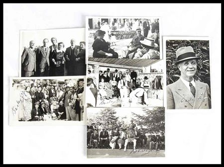 Fotografie formato cartolina, 4 con autografo originale di Badoglio, e 2 senza firma. Foto di carattere privato, quando il Maresciallo d'Italia era in pensione, in un momento di vacanza alle terme di Fiuggi