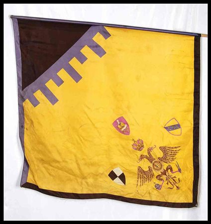 Nobile Contrada dell'Aquila, bandiera in cotone stampato. Stemma giallo con : aquila bicipite imperiale coronata all'antica con negli arti scettro, spada e globo imperiale; sole dorato in petto con le iniziali U.I (Umberto I di Savoia). Anni '70