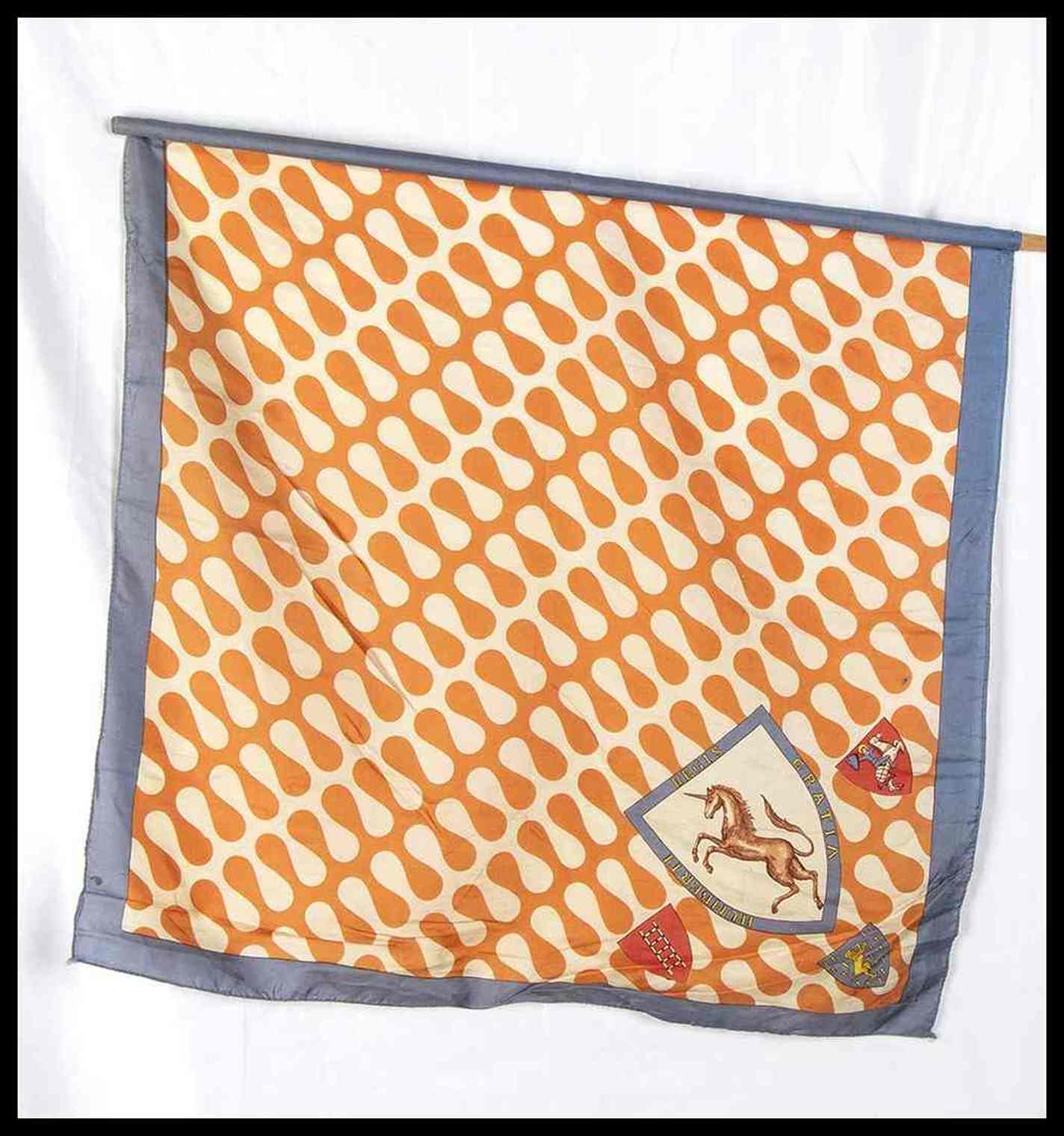 Nobile Contrada del Leocorno, bandiera in cotone stampato. Un unicorno rampante su uno stemma d'argento con bordo blu dove si trova il motto in oro "HUMBERTI REGIS GRATIA". Anni '70