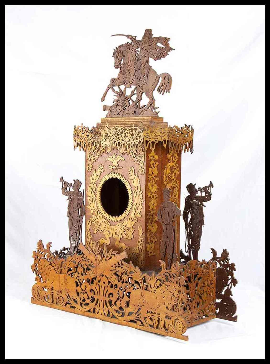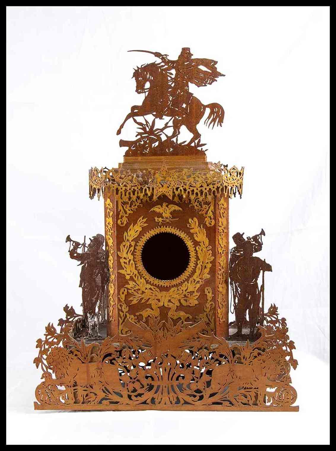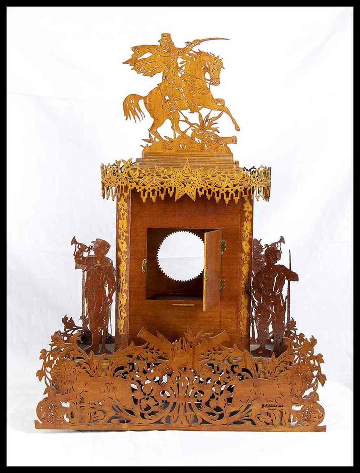 Cassa in legno a simulare un monumento commemorativo, intagliate ed intarsiata con allegoria garibaldina, per celebrare l'impresa dei Mille. Corpo rettangolare verticale poggiante su base rettangolare orizzontale; in cima figura di Giuseppe Garibaldi a cavallo; riproduzione della STELLA DEI MILLE, stella a sette punte con trinacria intagliata e dicitura I MILLE AL LORO CAPO, che fu donata a Garibaldi dai suoi soldati all'indomani della spedizione del 1860; agli angoli della base ci sono quattro figure di soldati con tromba e fucili; intaglio alla base con motivo di due leoni poggianti le zampe su due stelle con relativa dicitura EUROPA , AMERICA (ad indicare i Due Mondi), e cannoni incrociati, ripetuti alle due facciate; corpo centrale con apertura tonda frontale e sportello posteriore per alloggiamento di un orogologio meccanico e relativo meccanismo, Il tutto in legno leggero, bel cimelio presumibilmente realizzato per incontro reducistico o più probabilmente per omaggio mai consegnato all'Eroe dei Due Mondi, seconda metà '800