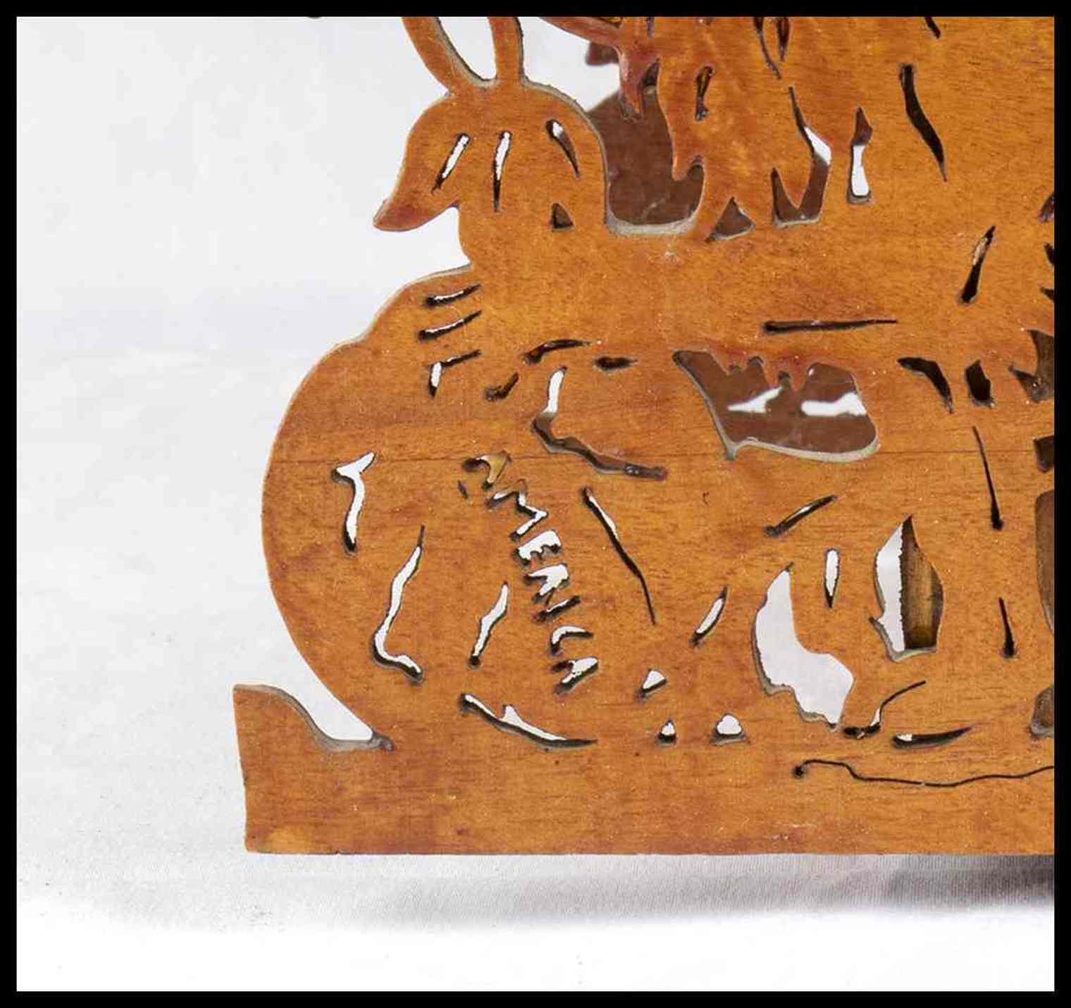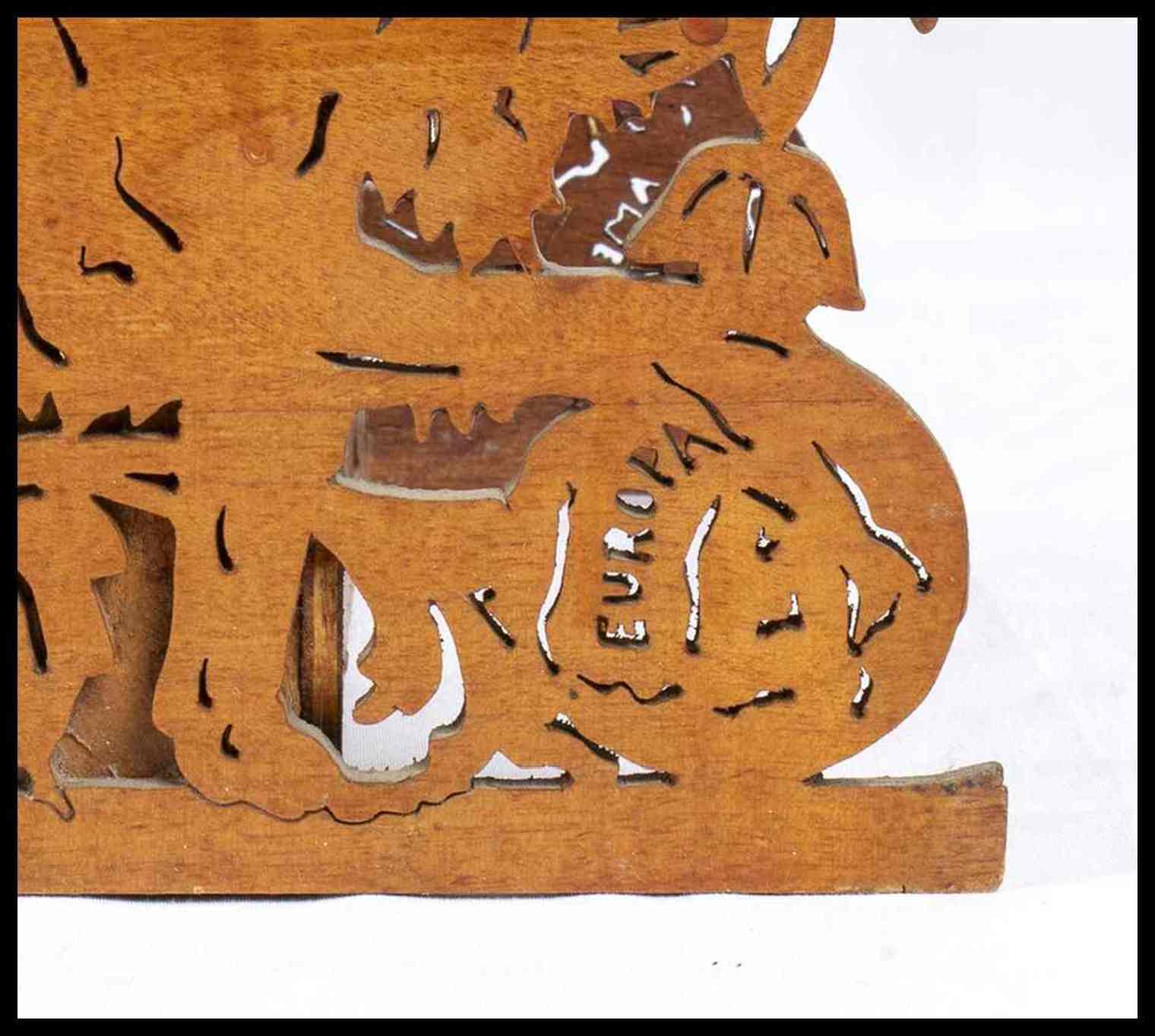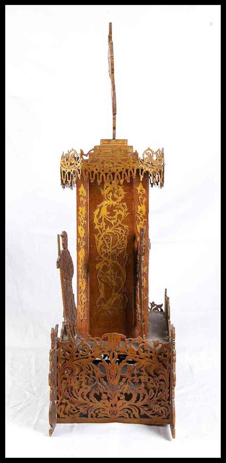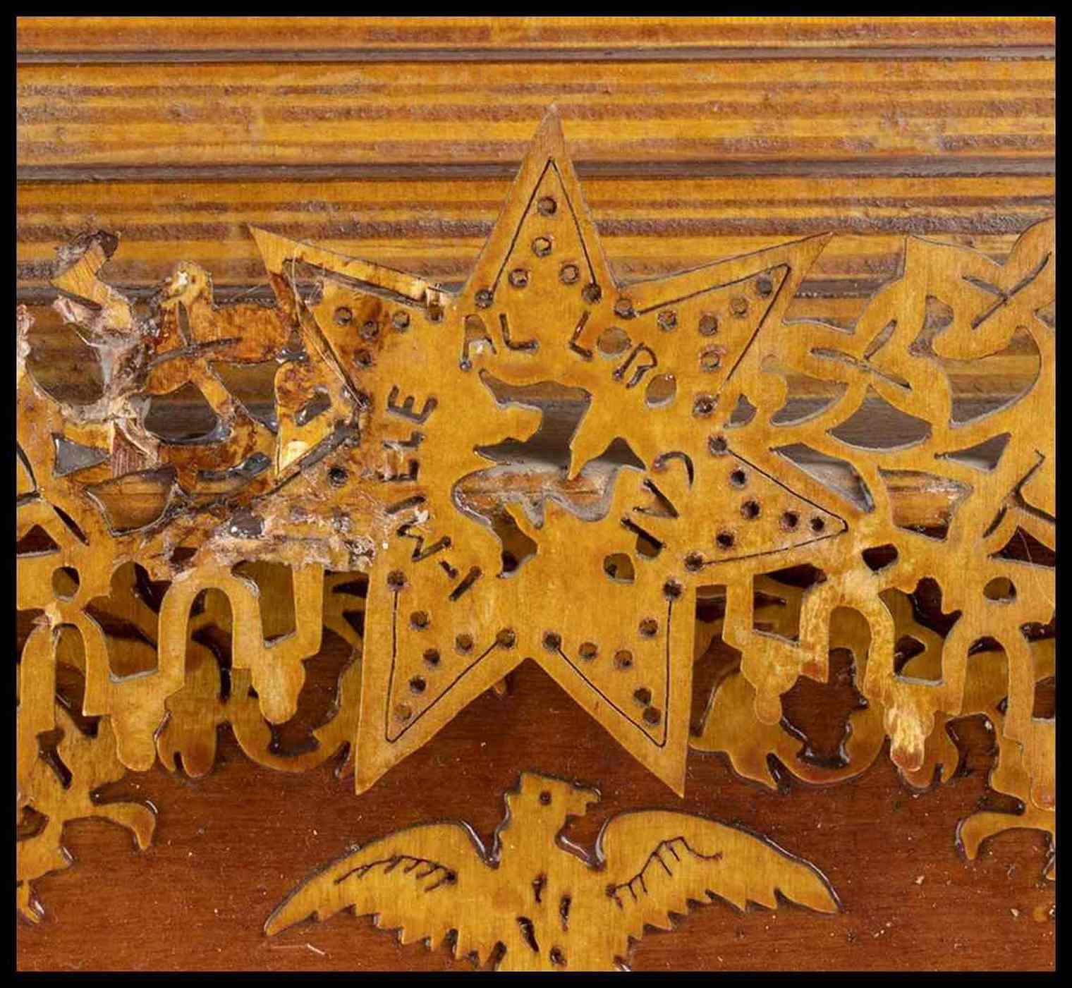 Cassa in legno a simulare un monumento commemorativo, intagliate ed intarsiata con allegoria garibaldina, per celebrare l'impresa dei Mille. Corpo rettangolare verticale poggiante su base rettangolare orizzontale; in cima figura di Giuseppe Garibaldi a cavallo; riproduzione della STELLA DEI MILLE, stella a sette punte con trinacria intagliata e dicitura I MILLE AL LORO CAPO, che fu donata a Garibaldi dai suoi soldati all'indomani della spedizione del 1860; agli angoli della base ci sono quattro figure di soldati con tromba e fucili; intaglio alla base con motivo di due leoni poggianti le zampe su due stelle con relativa dicitura EUROPA , AMERICA (ad indicare i Due Mondi), e cannoni incrociati, ripetuti alle due facciate; corpo centrale con apertura tonda frontale e sportello posteriore per alloggiamento di un orogologio meccanico e relativo meccanismo, Il tutto in legno leggero, bel cimelio presumibilmente realizzato per incontro reducistico o più probabilmente per omaggio mai consegnato all'Eroe dei Due Mondi, seconda metà '800