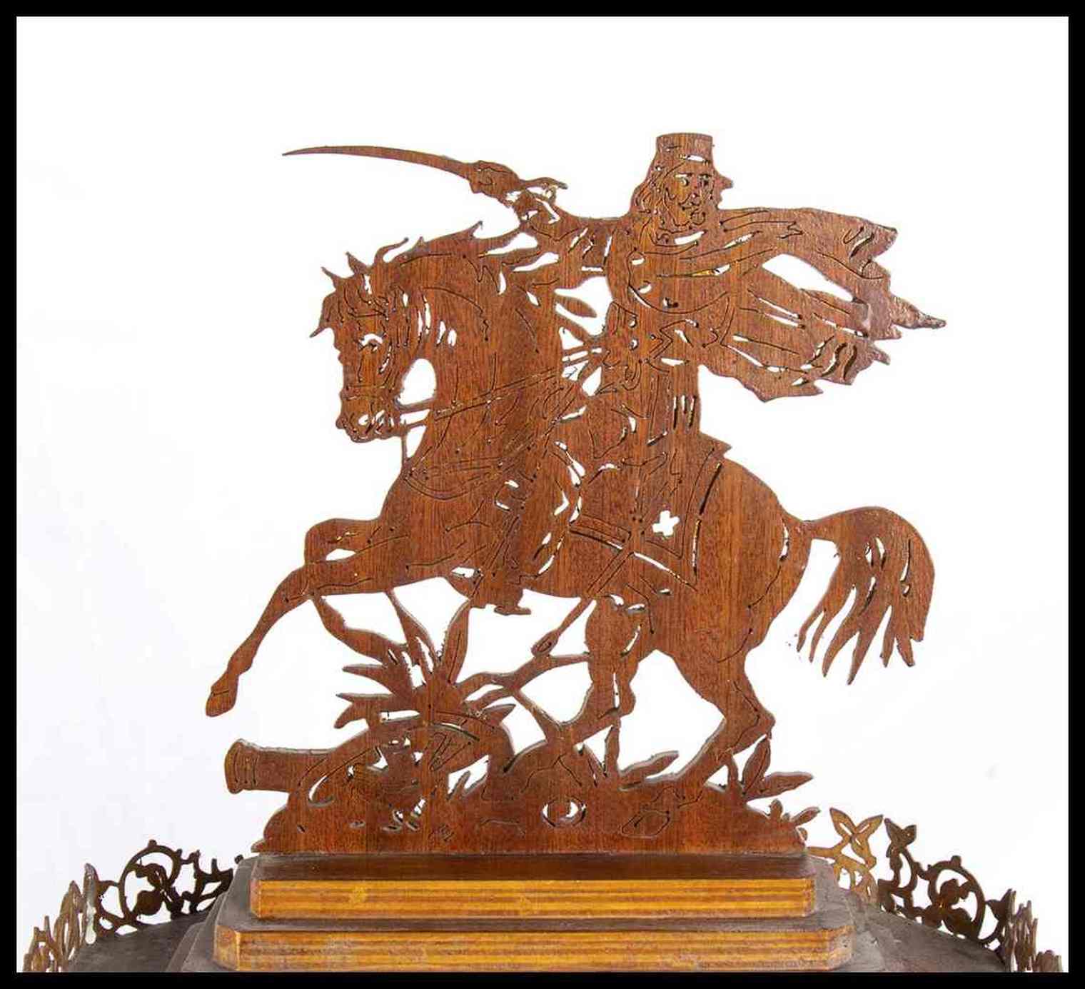Buona conservazione, figura di Garibaldi con lievi danni alla sciabola ed alla base delle zampe del cavallo, qualche mancanza agli intagli. Molto delicato. Mancante dell'orologio, presumibilmente mai montato uno. Misura cm. 73x51x20
