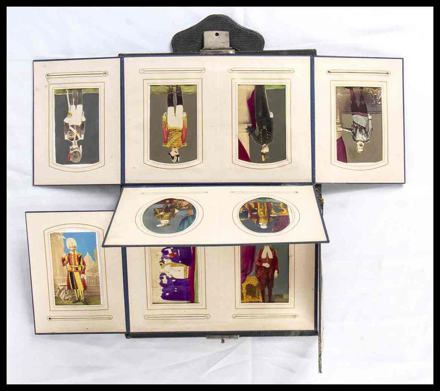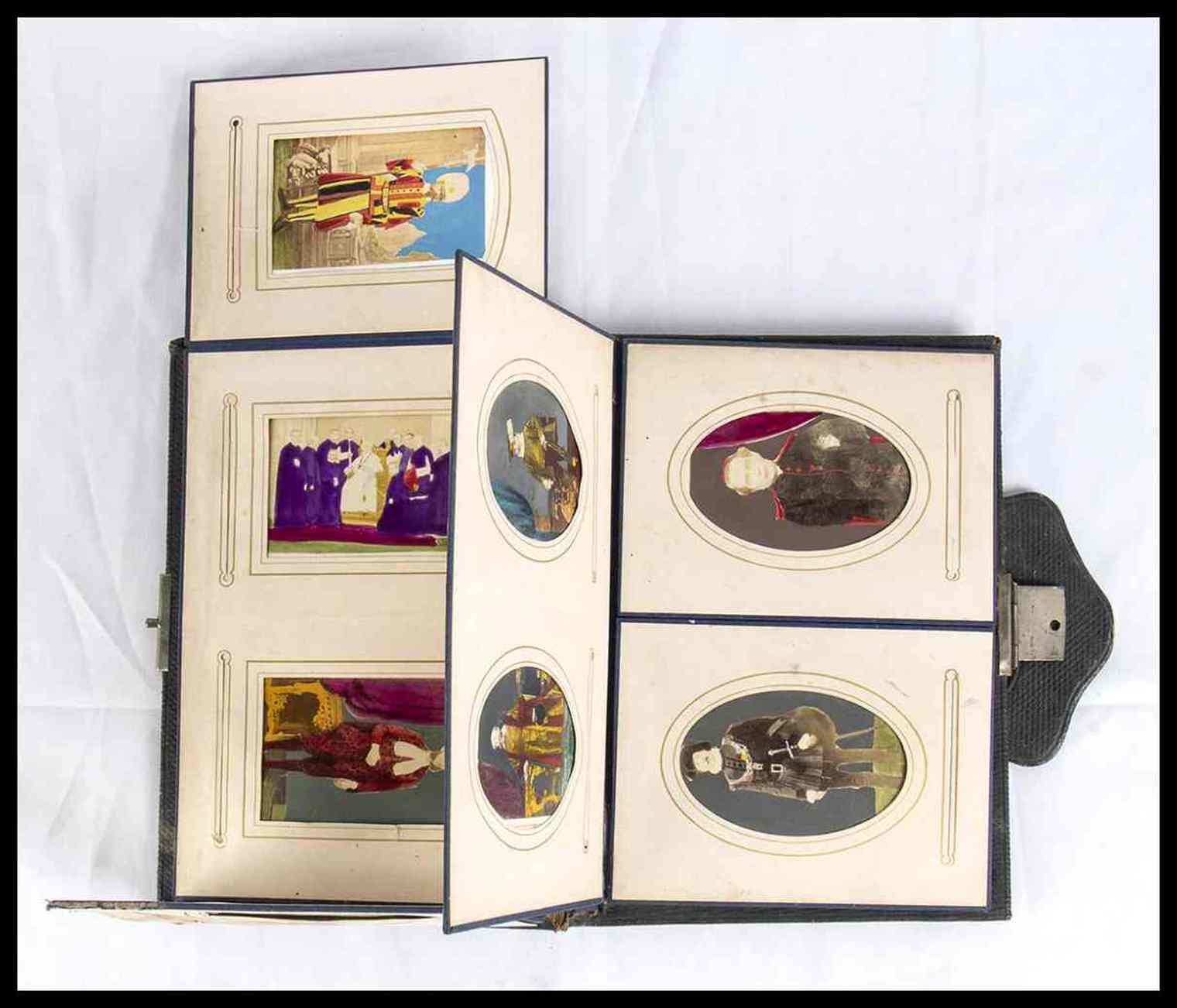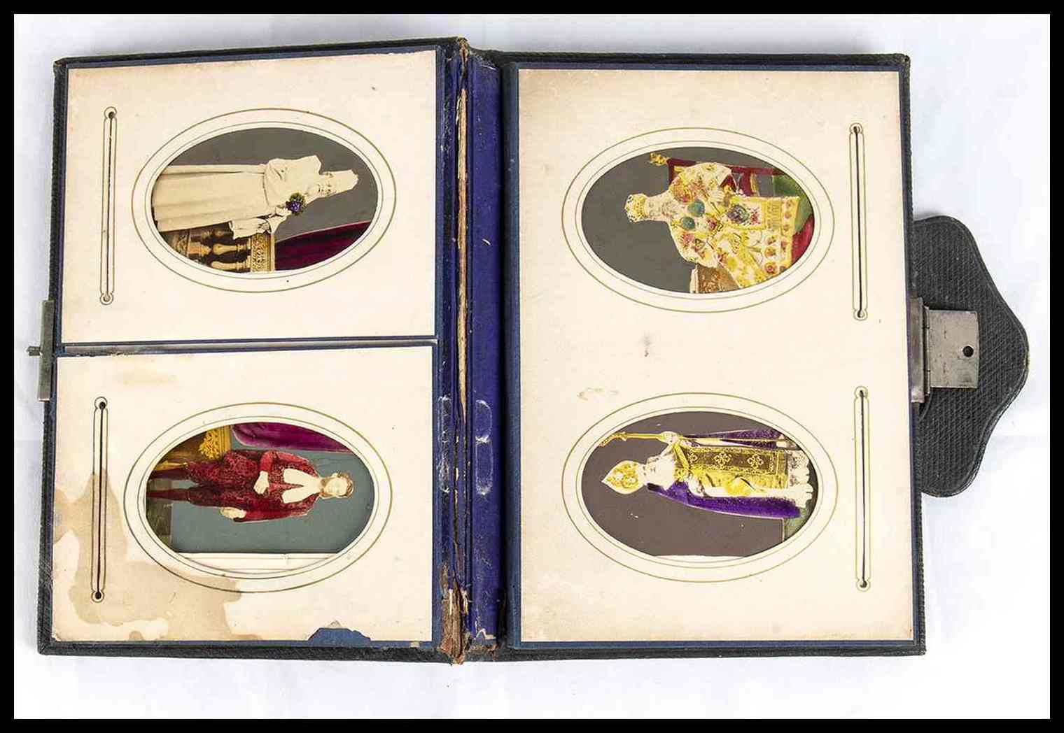Prezioso album con raccolta di 16 foto formato CDV, acquarellate, con ritratti di Papa PIO IX, Cardinale Antonelli, soldati della Guardia Svizzera, Guardia Nobile, Generale Hermann Kanzler, Cameriere di Spada e Cappa (Cameriere Segreto di Sua Santità), nobiltà pontificia, prelati. Le foto sono originali dell'epoca, alcune firmate al retro. Misurano mediamente cm.9x6 ciascuna, sono raccolte in un album che aprendolo funge da espositore consultabile. Struttura rigida in legno e cartone, con mancanze.