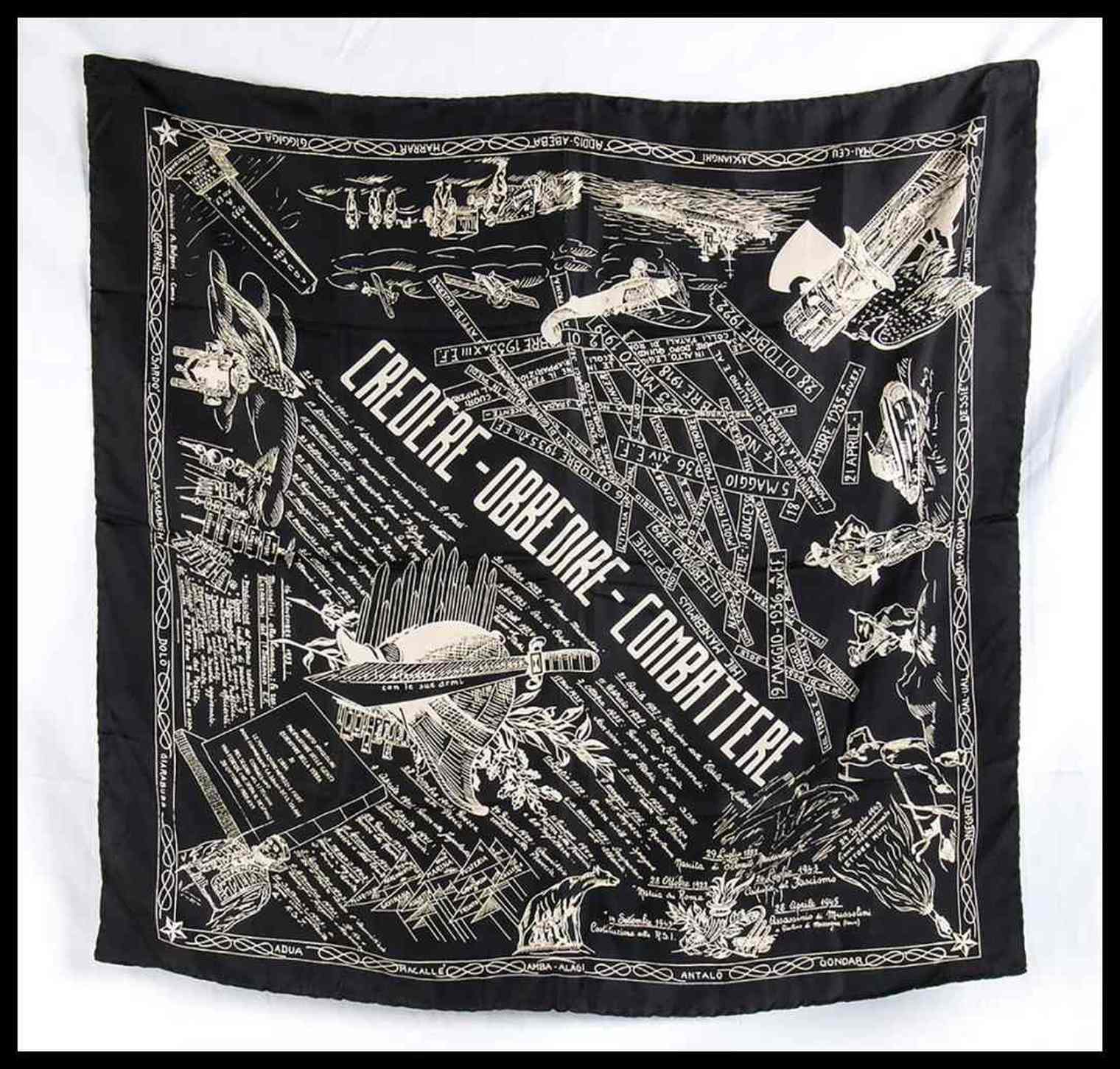 Foulard , fazzoletto in seta, nero con stampa in bianco del motto CREDERE OBBEDIRE COMBATTERE , delle date e località di battaglie in Africa: Adua 1935, Giarabub, Macallè, Dolo, Antalo, Gondar, riportante altre citazioni della fondazione della RSI, dell'uccisione del Duce ed altro. Disegno di un Ascari in uniforme di guardia del Vicerè. Dedicato "a Benito Mussolini pacificatore delle genti"