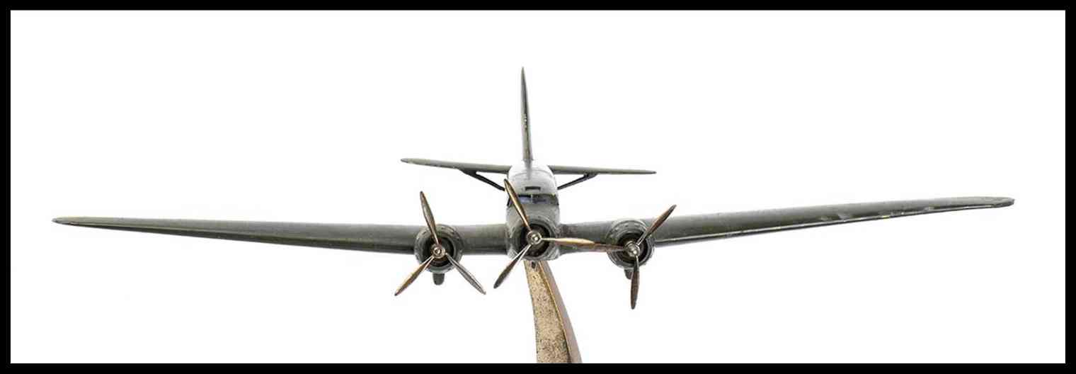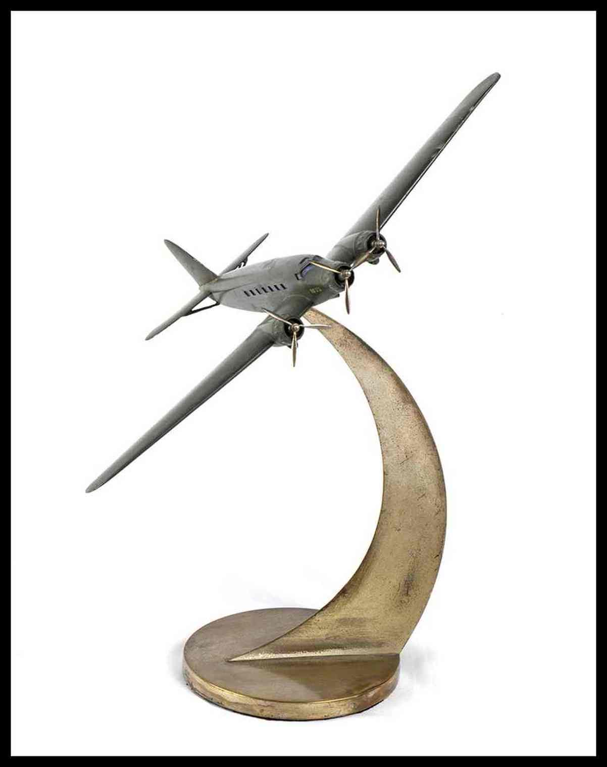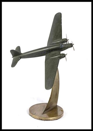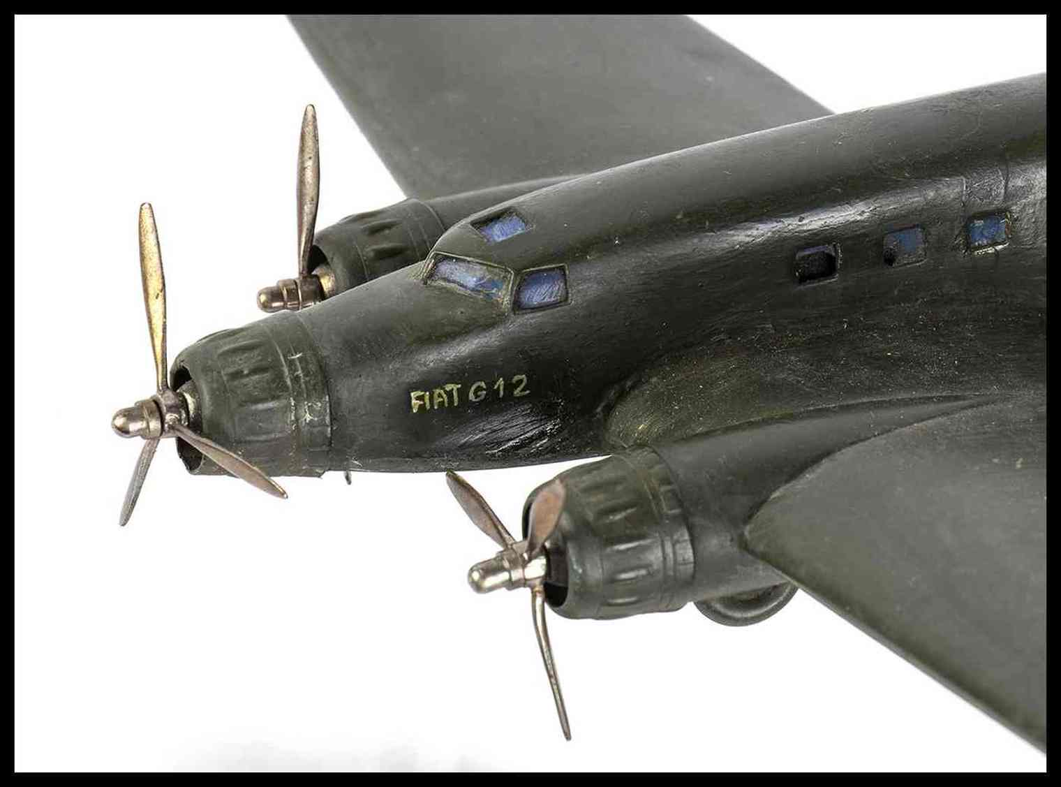 Modello del FIAT G12 , trimotore, con livrea verde scura (presumibilmente impiegato dall'Aeronautica Repubblicana nella RSI). In lamierino d'ottone, scatolato (quindi non fusione piena) con tre eliche rotanti, montato su base propria di metallo, a forma di scia di volo, con snodo alla pancia del velivolo