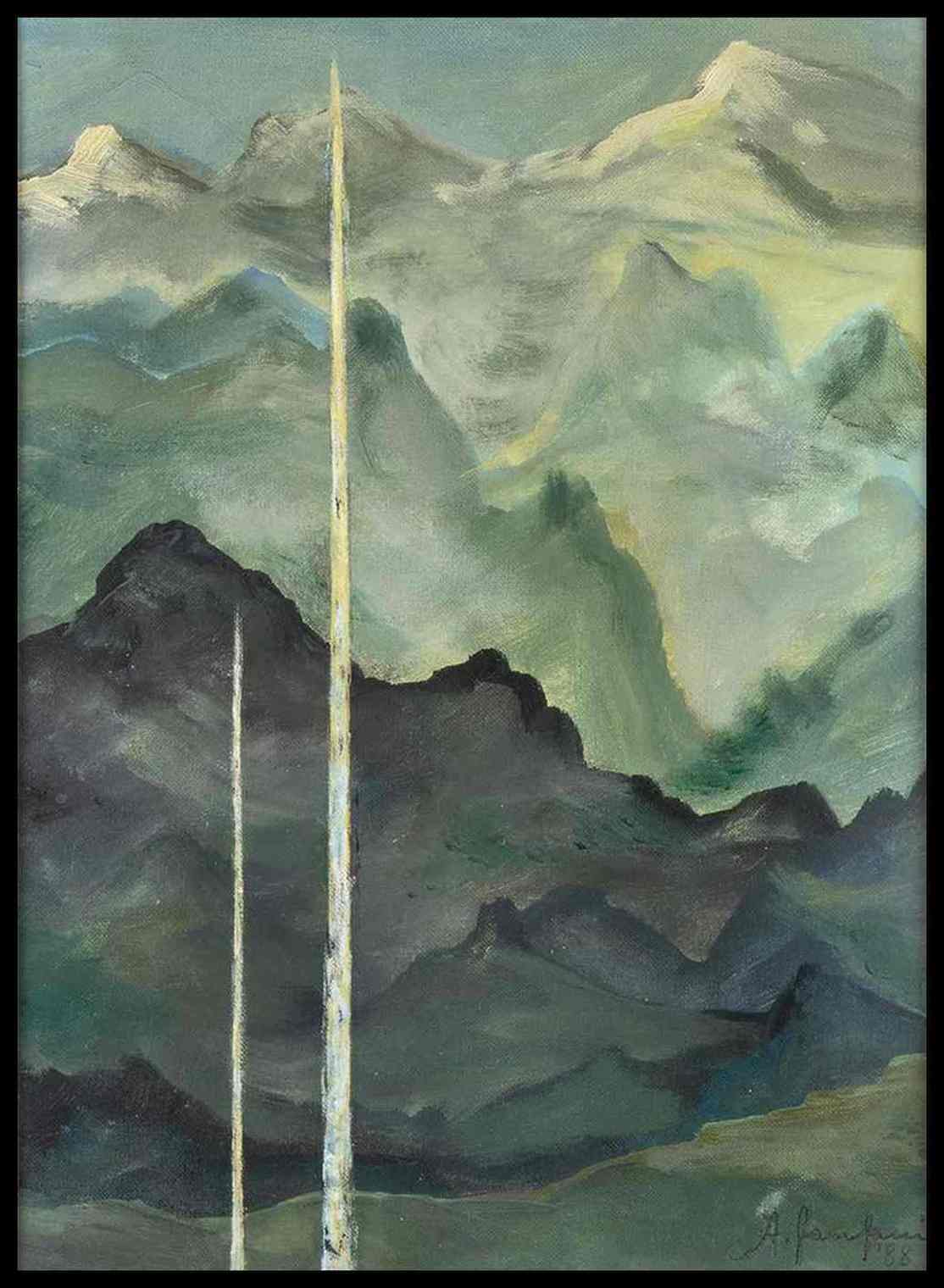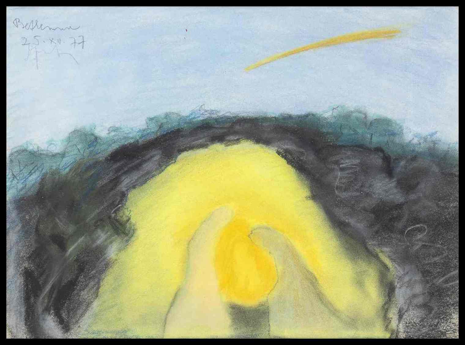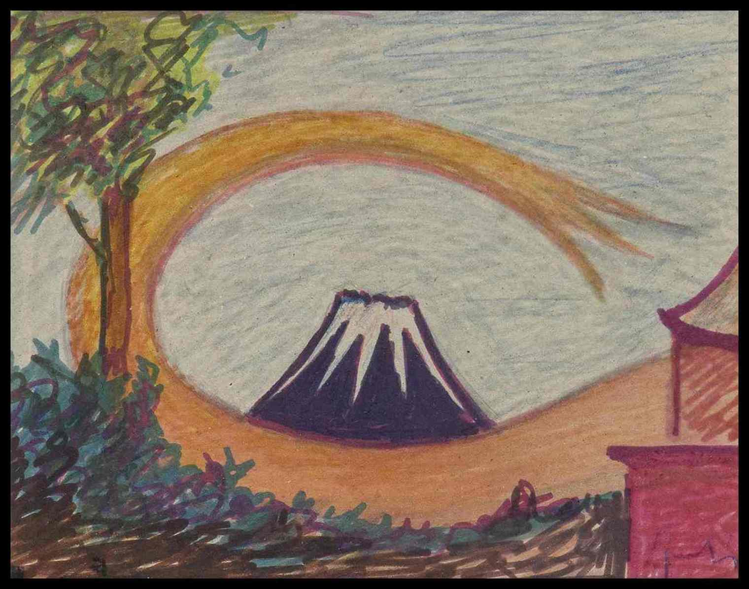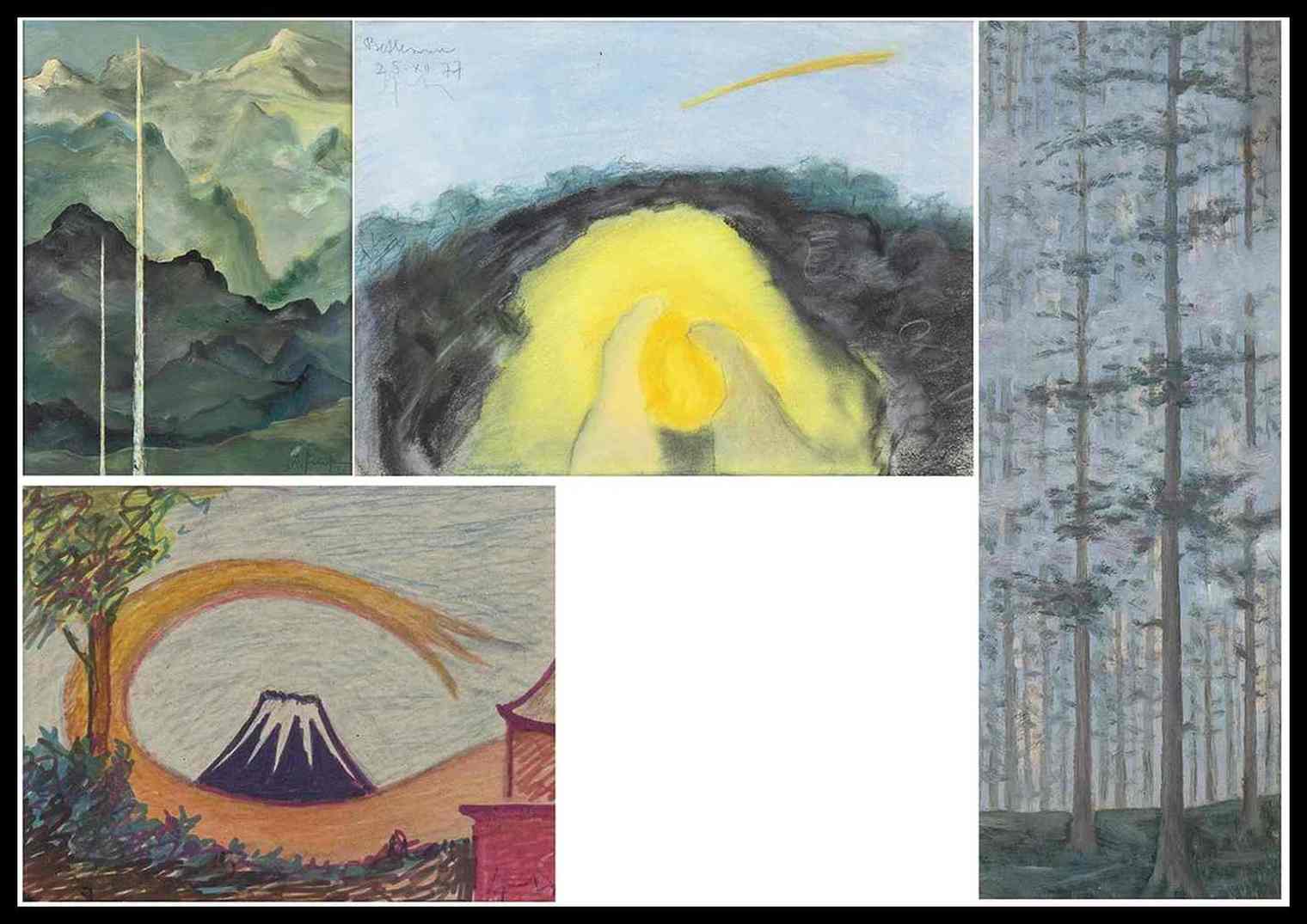 Lotto di quattro composizioni originali "Vulcano" pennarello e matite 1980 (?) firmato, "Betlemme" pastello su carta 1977 firmato, "Paesaggio montano" olio su cartoncino 1988 firmato, "Luci nel bosco" olio su tavoletta 1955 firmato. In cornice