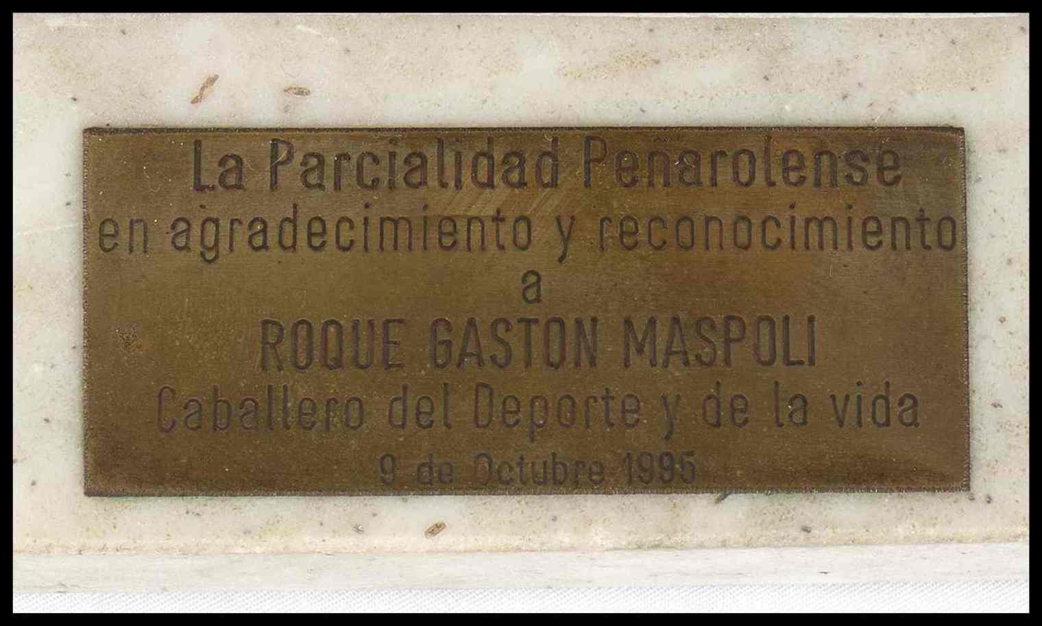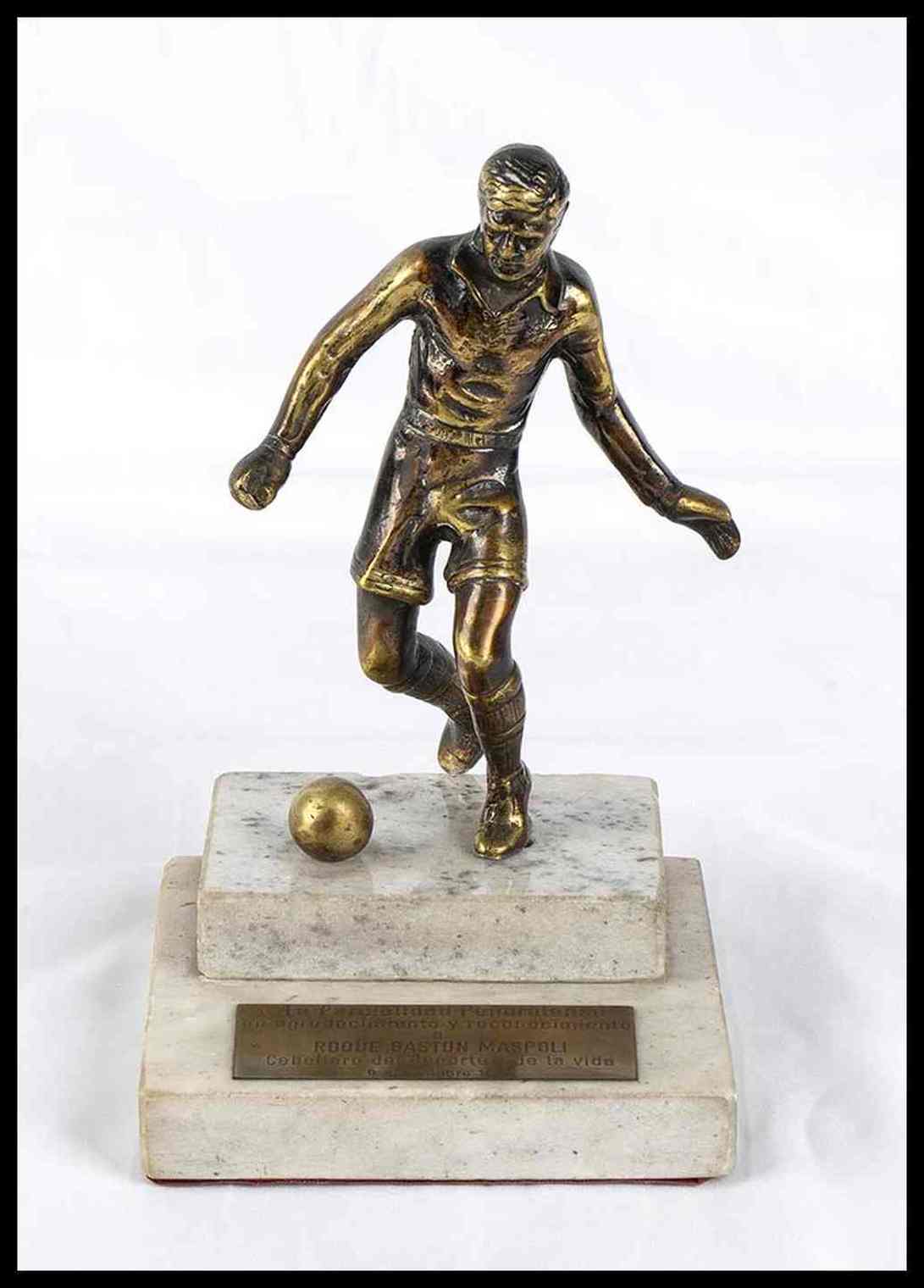 Statuina in bronzo, regalata a Roque Gaston Maspoli, calciatore ed allenatore di diverse squadre uruguaiane e della nazionale dell' Uruguay.. Ai tempi dell'assegnazione di questo trofeo, Maspoli era allenatore del Peñarol. La statuina raffigurante un calciatore in azione di gioco, montata su base in marmo, con targhetta in ottone incisa recante la dedica " LA PARCIALIDAD PANAROLENSE - EN AGRADECIMIENTO Y RECONOCIMIENTO A - ROQUE GASTON MASPOLI - CABALLERO DEL DEPORTE Y DE LA VIDA - 9 DE OCTUBRE 1995 " - Provenienza ex Museo dello Sport di Torino