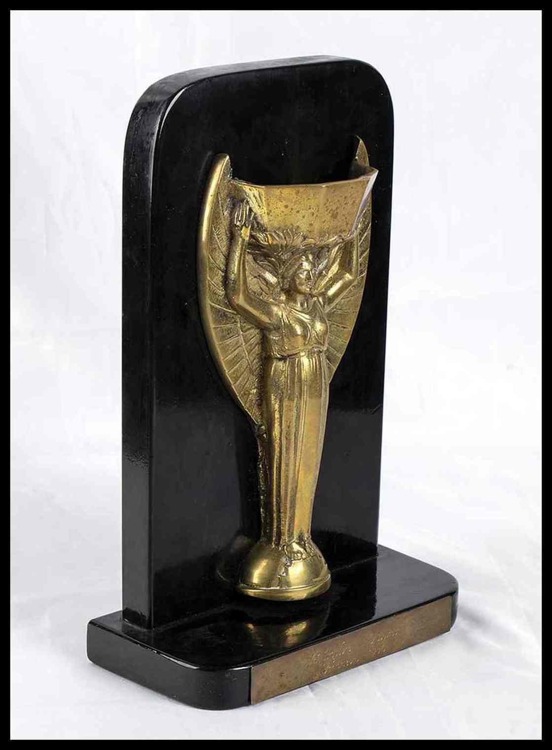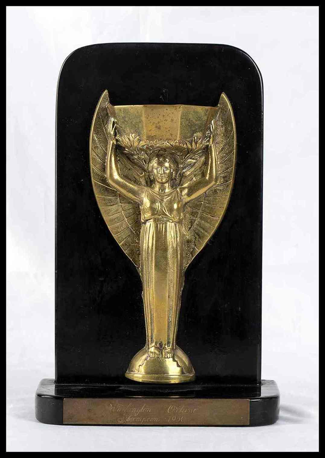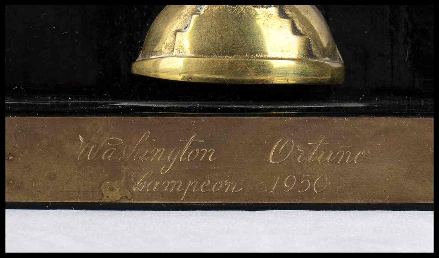 Riproduzione della Coppa RIMET, il trofeo per il campionato mondiale di calcio assegnato nel periodo 1930-1970 alla squadra vincitrice del torneo. Il trofeo realizzato in bronzo, montato su supporto di legno, venne dato ad ogni singolo calciatore e componente dello staff della squadra dell' URUGUAY, campione del mondo nel 1930 e nel 1950, Questo è appartenuto a Washington Ortuño (Montevideo, 13 maggio 1928 – 15 settembre 1973) calciatore dell' Uruguay che vinse il titolo mondiale nel 1950, come riportato sulla targhetta applicata alla base. Misura come la coppa originale, riprodotta a mezzo tondo, ed è estremamente rara, considerando che dal 1970 la Coppa Rimet non è più assegnata ed è stata sostituita dall'attuale trofeo della F.I.F.A.