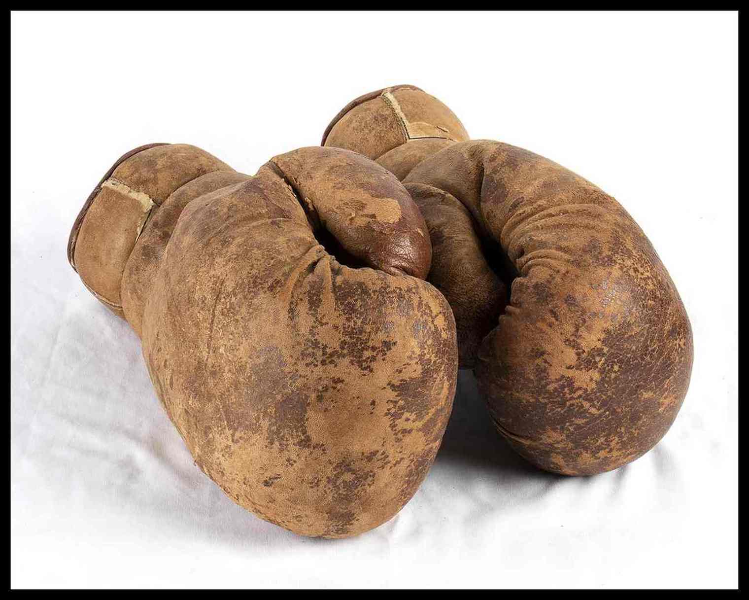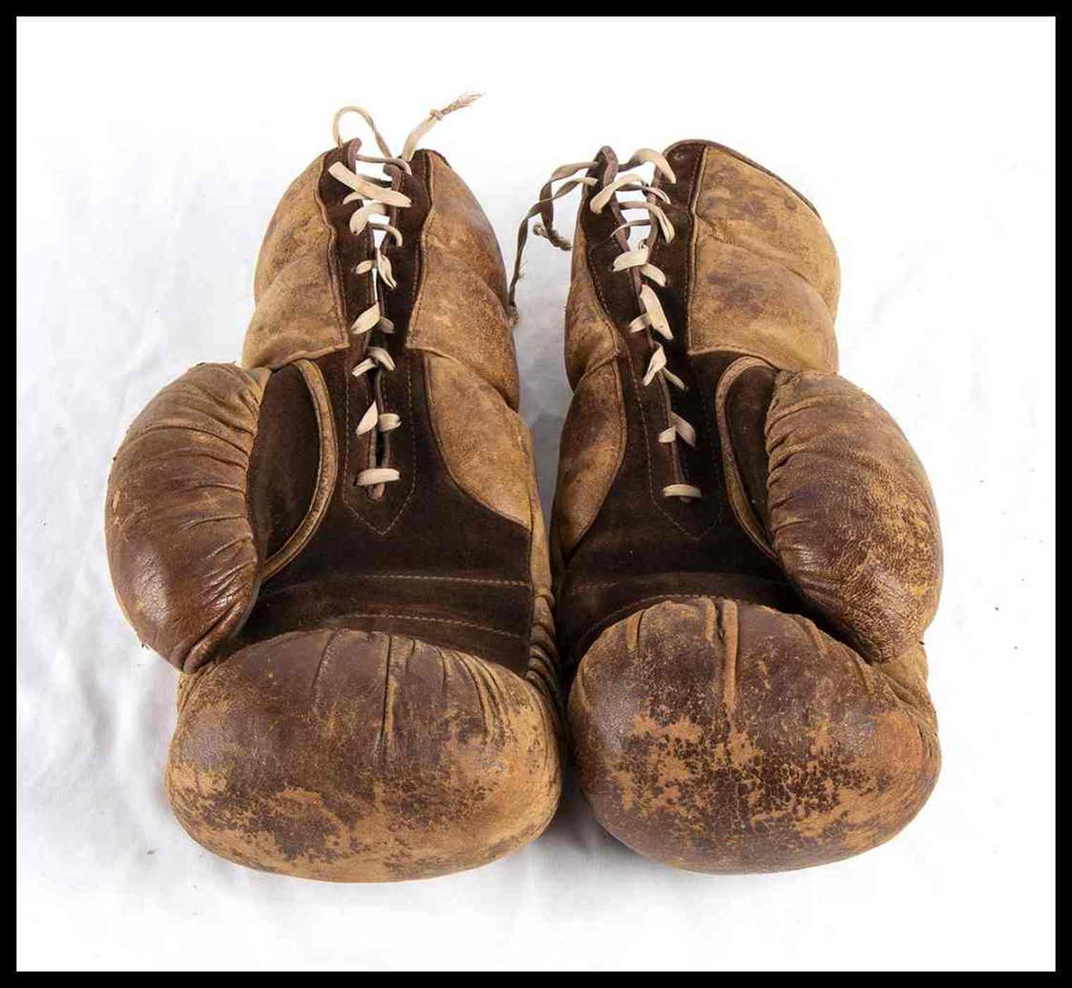 Paio di guantoni da pugilato , imbottiti, rivestiti in pelle, con lacci di chiusura, periodo anni '30