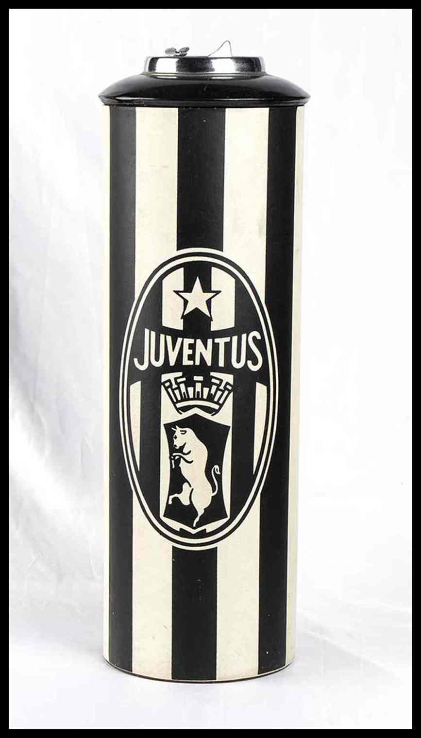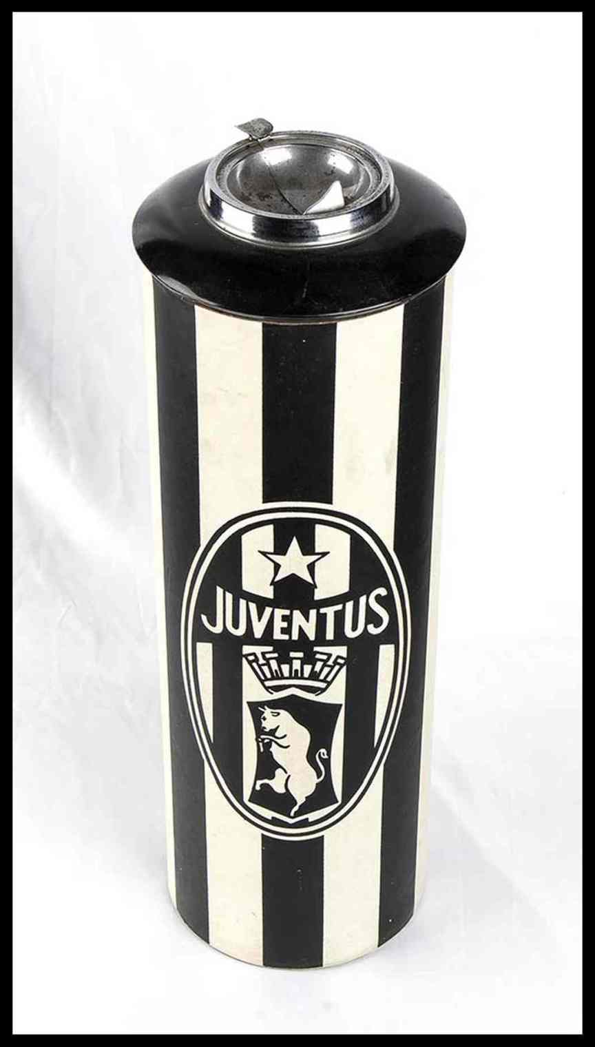 Posacenere con meccanismo di raccolta a scomparsa della cenere, brevettato negli anni '50, montato su un cilindro di cartone pressato e metallo. Il cilindro è confezionato con i colori bianco e nero della JUVENTUS F.C. football club, avente lo stemma del toro coronato e sormontato da una stella ad indicare i primi 10 titoli di Campione d'Italia, quindi del priodo anni '60-'70. Simpatico gadget, da usare come complemento di arredo