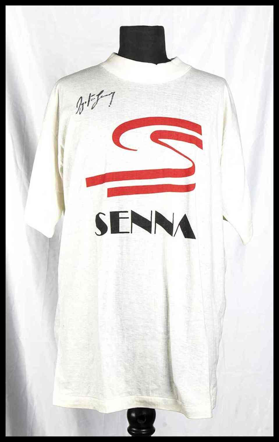 Maglietta in cotone bianco a maniche corte, modello pubblicitario AYRTON SENNA , firmata di pugno con pennarello indelebile nero da Ayrton Senna, (firma originale non stampata). Provenienza ex Museo dello Sport di Torino