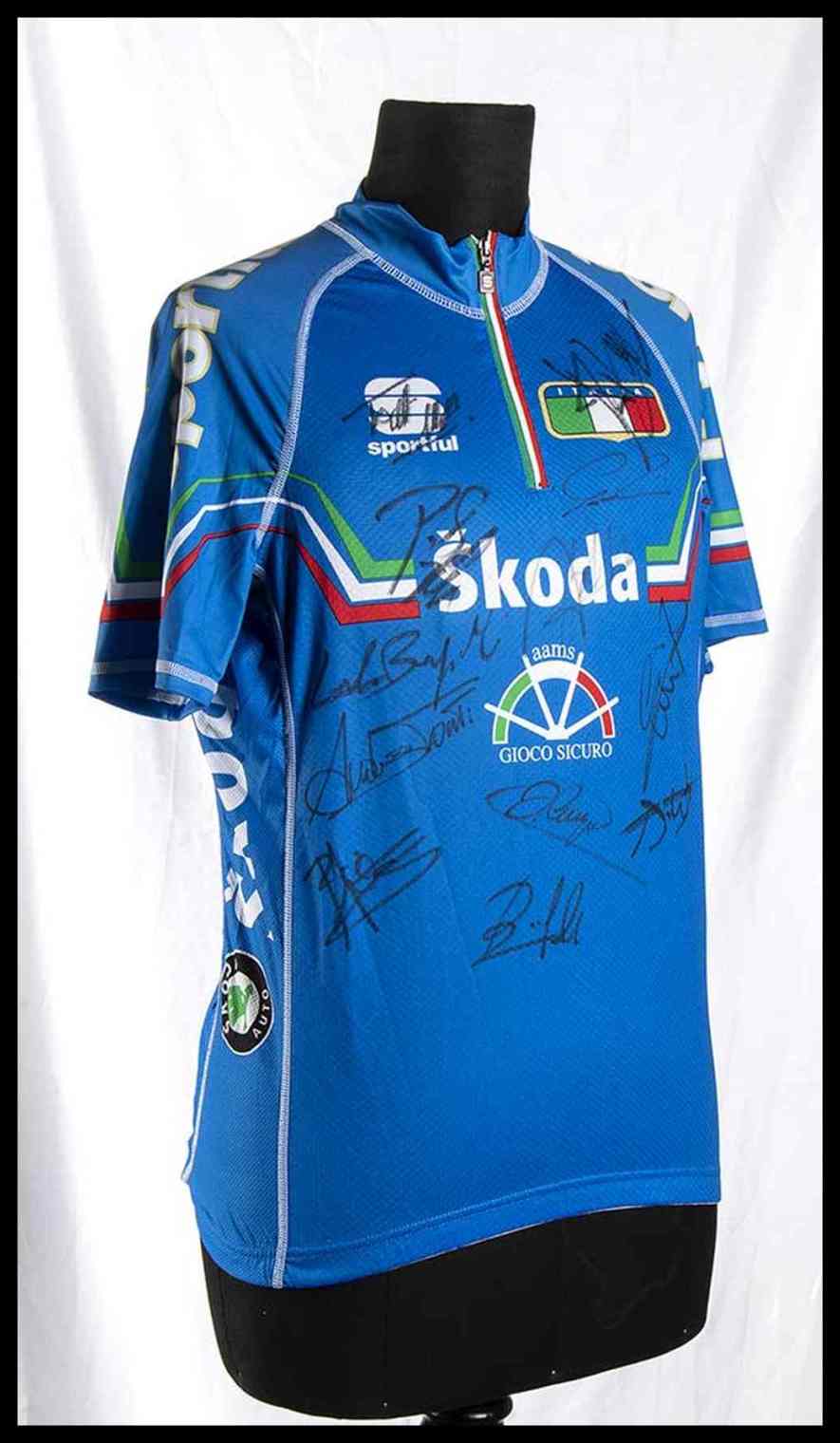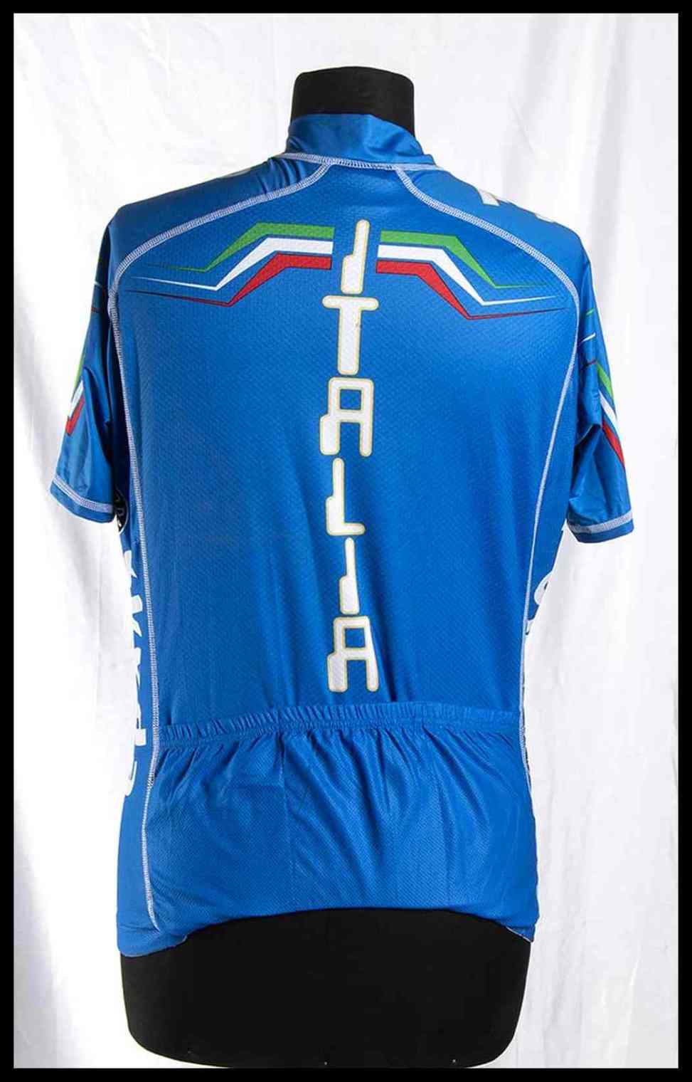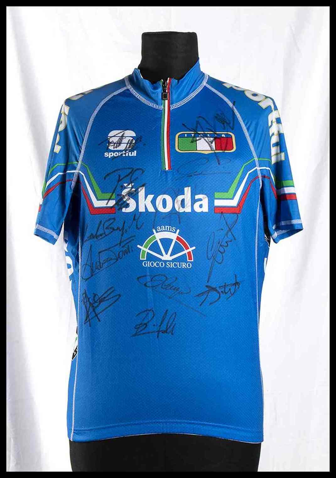 Maglia azzurra ITALIA di Damiano Cunego medaglia d'argento ai Mondiali del 2008. Autografata di pugno dai componenti della squadra nazionale, Damiano Cunego, Andrea Tonti, Davide Rebellin, Marzio Bruseghin, Matteo Tosatto, Gabriele Bosisio, Paolo Bettini, Alessandro Ballan, Luca Paolini, Leonardo Bertagnolli, Francesco Ginanni. Al petto baffi tricolori, sponsor SKODA - AAMS GIOCO SICURO - SPORTFUL stampati anche sulle maniche e sul fianco, alla sinistra lo scudetto tricolore. Zip con bordo tricolore. Tasche posteriori. Targhetta Sportful taglia S applicata internamente. Provenienza ex Museo dello Sport di Torino