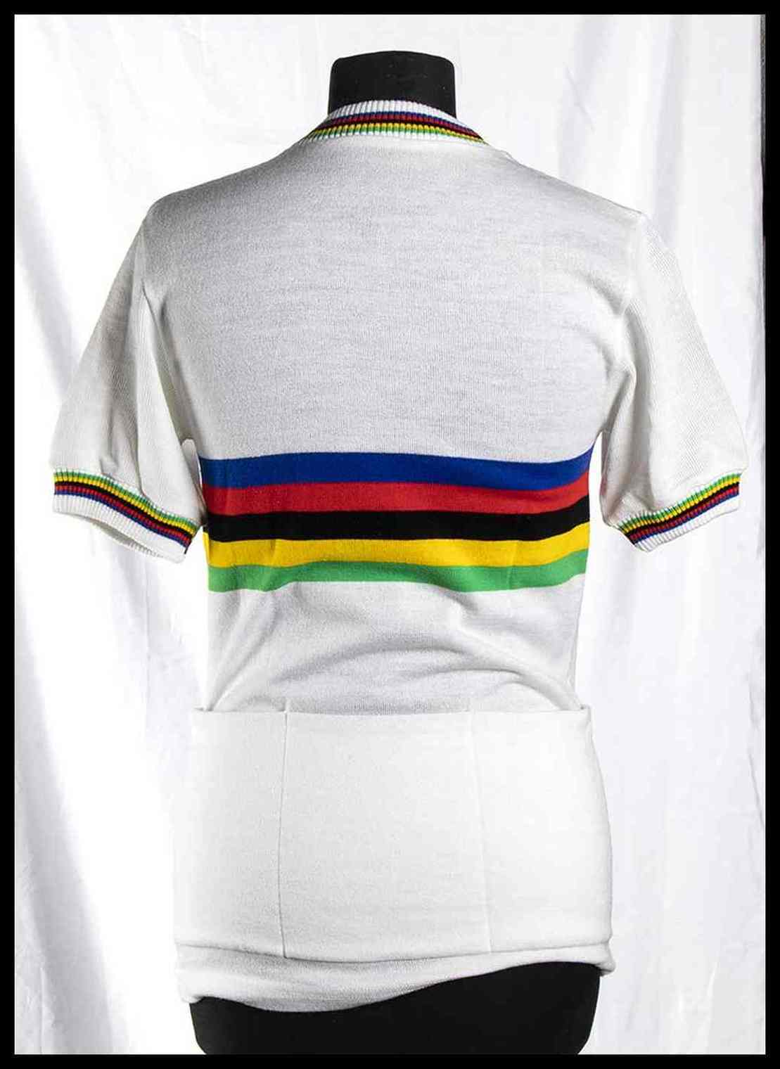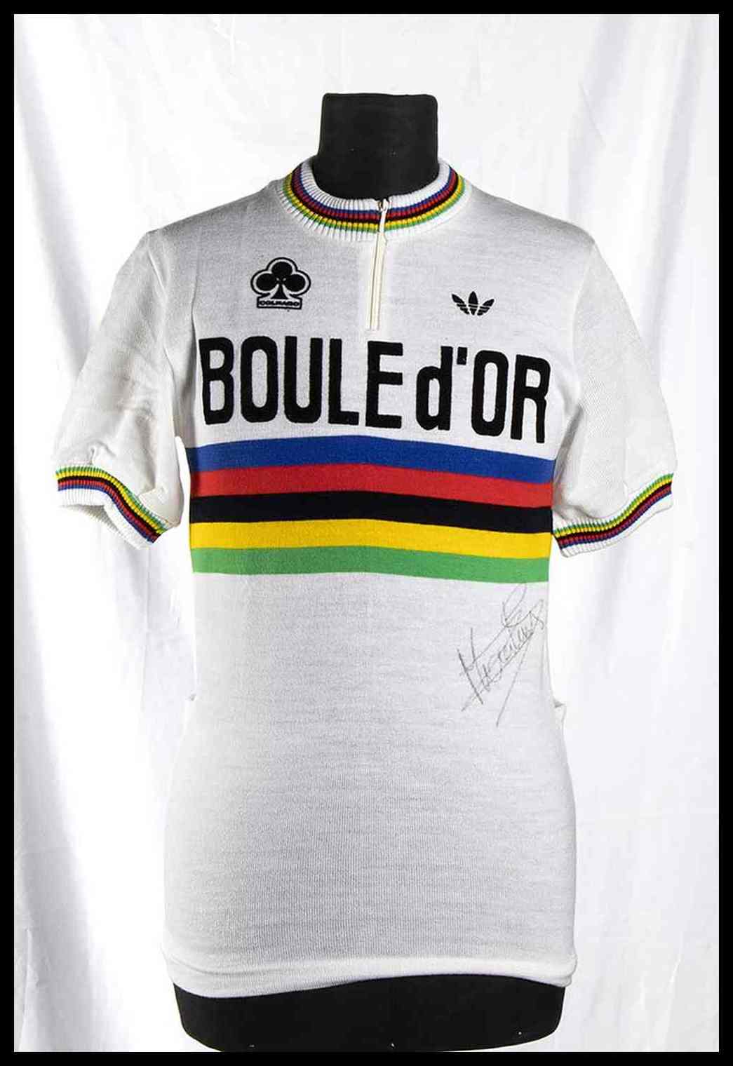 Maglia in cotone bianco, iridata, per il campione del mondo Freddy Maertens. Autografata di pugno da Maertens, sul fianco sinistro della maglia. Al petto, marchio ADIDAS a sinistra, sponsor COLNAGO a destra, BOULE D'OR stampato a caratteri cubitali al centro, sopra il cerchio iridato. Colletto e giromaninche con colori iridati. Anni 1981-82. Provenienza ex Museo dello Sport di Torino