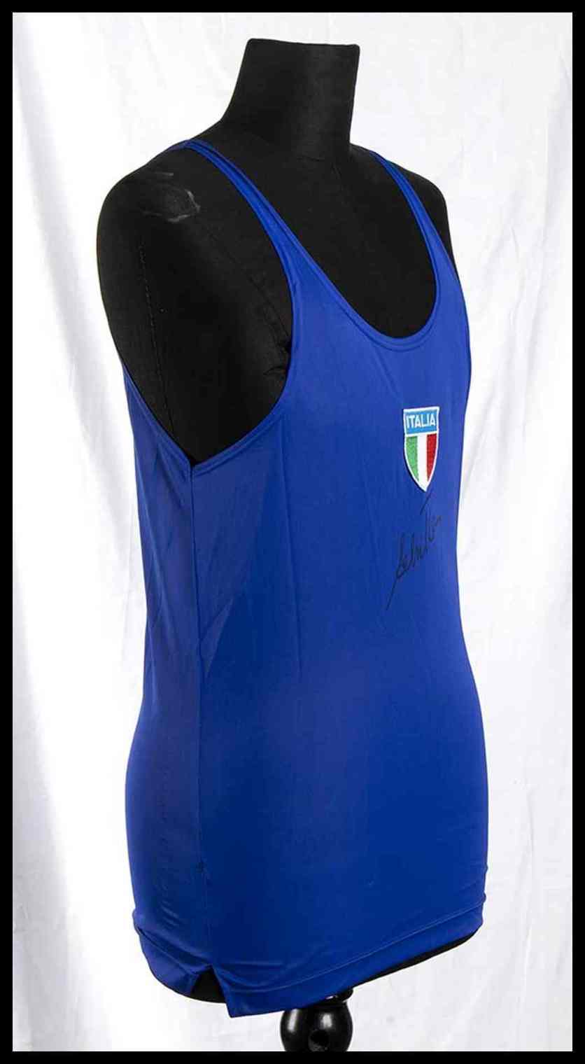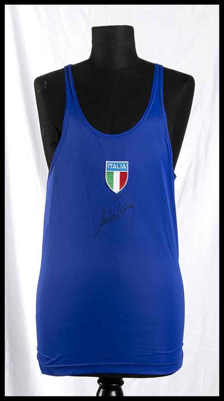 Maglia a canottiera, azzurra, atletica, di Alberto Cova. Al petto , scudetto tricolore ITALIA ricamato, cucito al centro. Per le Olimpiadi di Los Angeles del 1984. Autografo scritto di pugno da Alberto Cova, a pennarello nero indelebile, alla parte frontale della maglia. Provenienza ex Museo dello Sport di Torino